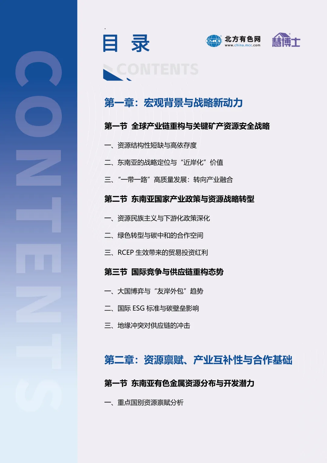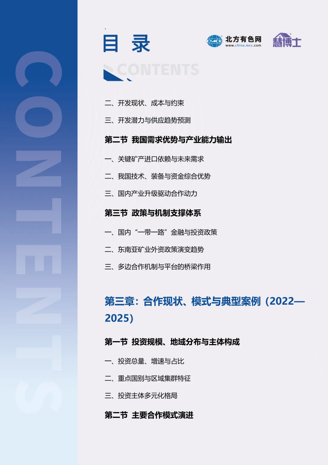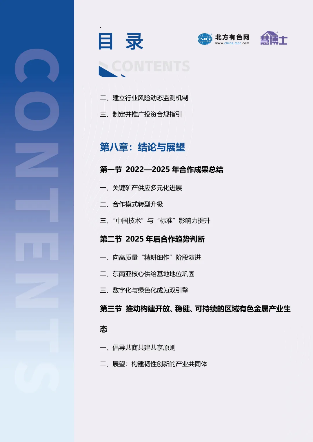 报告系统评估了东南亚主要资源国的禀赋条件与开发潜力,总结了以印尼镍产业链、老挝钾盐项目为代表的合作成果与模式演进,并对新能源金属、绿色冶炼、循环经济、数字化等重点前沿方向进行展望。