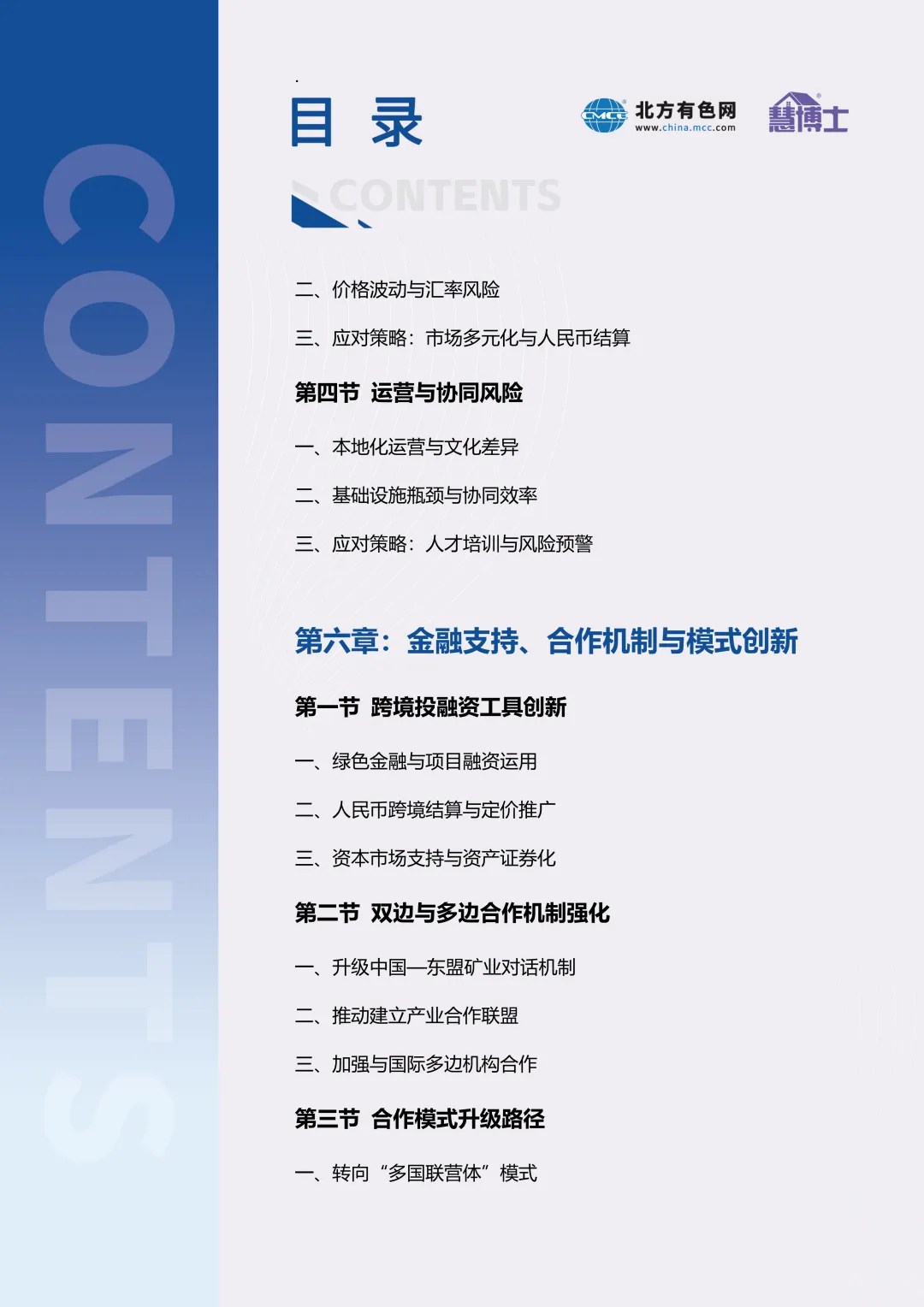 本报告从宏观背景出发,深入分析东南亚国家以“资源民族主义”和绿色转型为代表的政策动向,以及RCEP框架下的区域一体化机遇。报告系统评估了东南亚主要资源国的禀赋条件与开发潜力,总结了以印尼镍产业链、老挝钾盐项目为代表的合作成果与模式演进,并对新能源金属、绿色冶炼、循环经济、数字化等重点前沿方向进行展望。同时,报告识别了合作中面临的政策变动、ESG合规、地缘政治与运营协同等多重风险,并提出涵盖金融创新、机制建设与风险防控的系统性应对策略。
