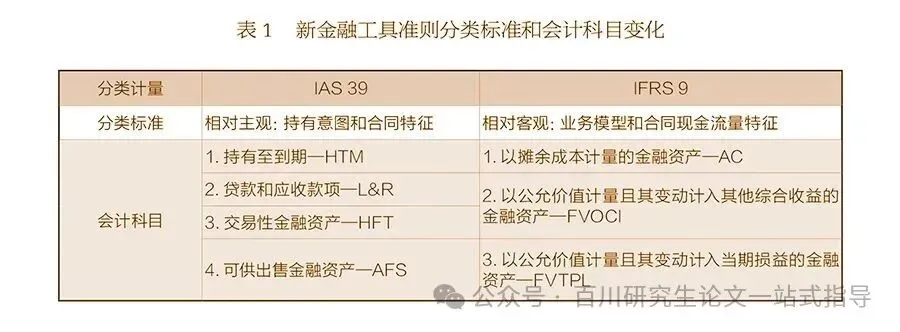 IFRS 9将IAS 39的四分类(交易性金融资产、可供出售金融资产、贷款和应收款项、持有至到期投资)简化为三分类:以公允价值计量且其变动计入当期损益的金融资产(FVTPL)、以公允价值计量且其变动计入其他综合收益的金融资产(FVOCI)和以摊余成本计量的金融资产(AC),如表1所示。