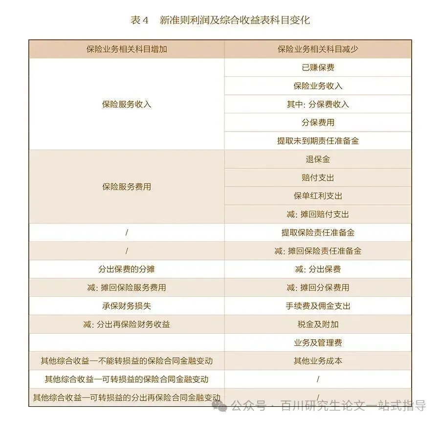 新保险合同准则优化了财务报表的列报方式,新准则合并原保险合同与再保险合同科目,仅列示“保险合同资产”“保险合同负债”“分出再保险合同资产”“分出再保险合同负债”四类。投连险、万能险不再拆分独立账户,原“保户储金及投资款”“独立账户负债”等科目取消。由于新准则对保险合同边界的明确规定,与保险合同相关的应收应付往来原则上都将被纳入保险合同负债的计量,资产负债表相关科目被精简。“预收保费”得到保留但意义有所变化,仅保留未匹配保费的临时性记录。表3梳理了新准则资产负债表中与保险业务相关的主要科目变化。