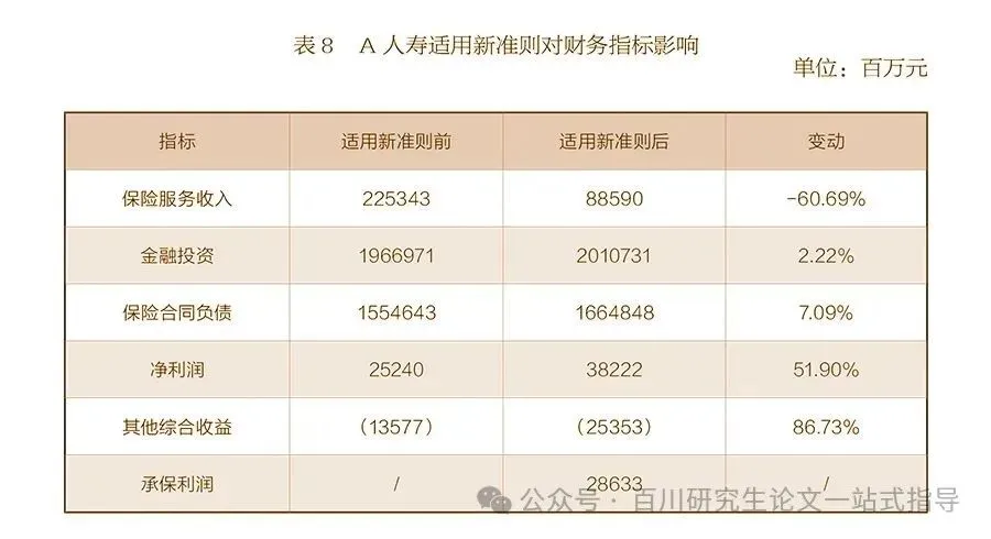 以A人寿年报中披露的主要财务指标为例,如表8所示,新准则对财务指标影响主要体现在:一是保险服务收入。对比旧准则下的保险业务收入,A人寿新准则下相同概念的保险服务收入大幅下降,下降比例超过60%,原因是长期险投资成分需从保险业务收入中剔除,不同产品线的收入更为可比,保险业务收入在保险期间内随服务提供逐步确认。二是金融投资。新准则下计量的金融投资规模较切换前扩大2.2%,主要原因是新准则下公允价值计量范围扩大,重分类的金融工具公允价值和成本计量存在一定差异。三是保险合同负债。由于新准则下使用当日无风险收益率曲线折现,较旧准则下采用750日移动平均计算的保险合同负债增加7.09%。在新准则下部分保险业务合并入保险合同负债共同计量,可以更好地反映保险业务规模。四是净利润。新准则下,折现率下降导致负债增加的影响计入其他综合收益,金融资产重分类导致公允价值变动计入其他综合收益,净利润较旧准则增加,其他综合收益较旧准则减少,表现为净利润和其他综合收益的变动均超过50%。五是承保利润。该指标为新准则下人身险公司新引入的概念。通过完全排除投资利润的方式,排除了金融市场的短期波动对利润的影响。由于负债折现率充分反映负债端现金流特征及当前市场信息,承保利润更好地反映了承保活动对公司利润的贡献。
