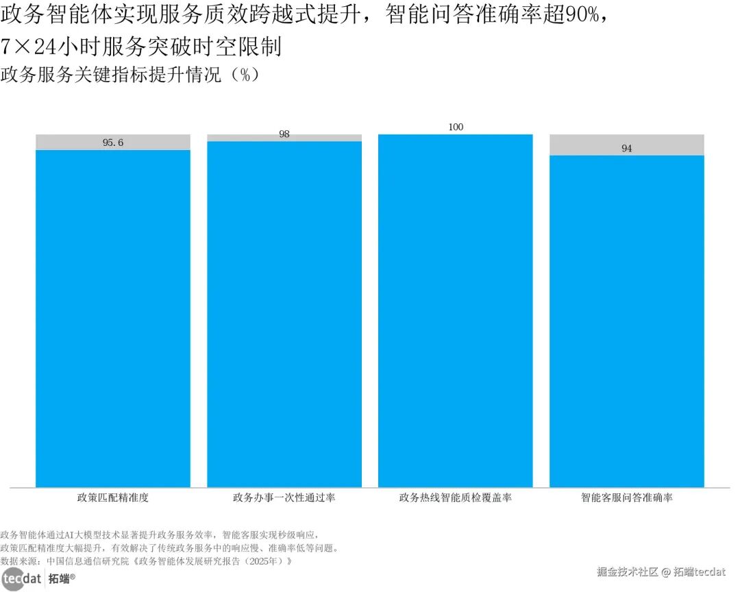 政务智能体通过AI大模型技术显著提升政务服务效率,智能客服实现秒级响应,政策匹配精准度大幅提升,有效解决了传统政务服务中的响应慢、准确率低等问题。数据来源:中国信息通信研究院《政务智能体发展研究报告(2025年)》