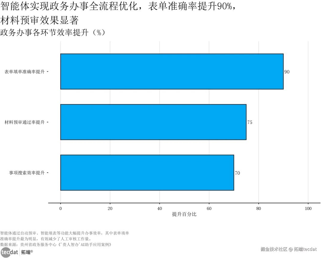 政务智能体应用成效灰底比例条形图表1数据EXCEL及图表PDF模板已分享到会员群3秒解读:智能客服问答准确率94%、政务办事一次性通过率98%,核心指标均超90%,7×24小时服务打破时空限制,政务服务从“8小时窗口”转向“全天候响应”。行动建议:政务信息化从业者可优先推进智能客服与政策匹配模块落地,快速提升群众办事体验;创业者可聚焦材料预审、表单填写等细分痛点,开发轻量化解决方案,切入政务数字化改造蓝海;投资者可关注政务智能体基础设施供应商,把握政策驱动下的规模化落地机遇。除了核心指标提升,政务智能体还实现了办事全流程的系统性优化:【图表7:智能体效能提升横向条形图】智能体实现政务办事全流程优化,表单准确率提升90%,材料预审效果显著政务办事各环节效率提升(%)