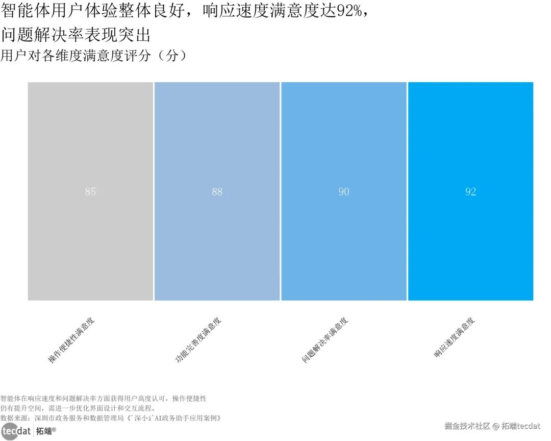 智能体在响应速度和问题解决率方面获得用户高度认可,操作便捷性仍有提升空间,需进一步优化界面设计和交互流程,降低中老年用户使用门槛。数据来源:深圳市政务服务和数据管理局《“深小i”AI政务助手应用案例》智能体用户满意度热力图图表10数据EXCEL及图表PDF模板已分享到会员群3秒解读:响应速度满意度92分,问题解决率90分,功能完善度88分,操作便捷性85分,整体体验优良,用户核心需求得到充分满足。行动建议:产品经理可针对操作便捷性优化界面设计,简化交互步骤,适配不同年龄段用户;客服管理者可建立用户反馈闭环,持续迭代响应话术与问题解决流程;政务部门可将用户满意度纳入智能体迭代考核指标,推动服务质量持续提升。小钩子:想获取《政务智能体落地实施方案模板》和全国31省政务智能体建设案例合集?进群领取,解锁细分场景操作指南与政策申报攻略,对接政务数字化项目资源。
