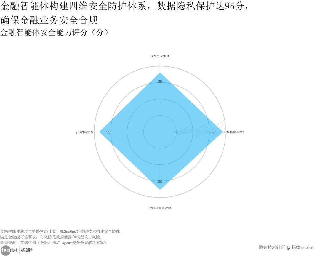 金融行业对安全合规的严苛要求,决定了智能体的落地核心围绕“安全+效率”双目标,构建了覆盖数据隐私、模型治理、内容安全、运营治理的四维防护体系,在保障合规的前提下实现降本增效。【图表2:金融智能体安全能力雷达图】金融智能体构建四维安全防护体系,数据隐私保护达95分,确保金融业务安全合规金融智能体安全能力评分(分)