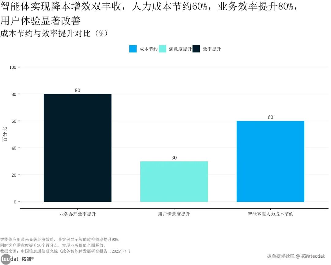 金融智能体通过全链路密态计算、MLSecOps等关键技术构建安全防线,满足金融级可信要求,有效防范数据泄露、模型攻击、合规风险等核心痛点。数据来源:艾瑞咨询《金融机构AI Agent安全合规解决方案》金融智能体安全能力雷达图表2数据EXCEL及图表PDF模板已分享到会员群3秒解读:数据隐私保护95分,行为内容安全92分,模型安全治理90分,智能体运营治理88分,安全能力全面达标,符合金融行业合规要求。行动建议:金融风控人员可重点强化数据隐私保护模块,采用密态计算技术保障客户数据安全;合规专员可建立智能体运营治理台账,定期开展安全审计与合规检查;金融科技企业可聚焦四维防护体系的轻量化解决方案,切入银行、保险等机构的数字化需求。金融智能体的价值不仅体现在安全防护,更在降本增效方面表现突出,与政务智能体形成互补格局:【图表5:智能体成本效益双Y轴图】智能体实现降本增效双丰收,人力成本节约60%,业务效率提升80%,用户体验显著改善成本节约与效率提升对比(%)