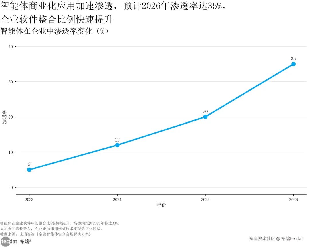 智能体商业化正加速渗透,从早期试点走向规模化落地,成为企业数字化转型的核心抓手,行业与区域分布呈现鲜明格局,孕育着结构性机会。【图表4:智能体商业化进展折线图】智能体商业化应用加速渗透,预计2026年渗透率达35%,企业软件整合比例快速提升智能体在企业中渗透率变化(%)