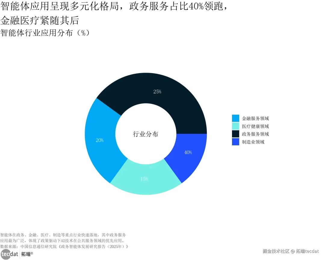 智能体在企业软件中的整合比例持续提升,高德纳预测2028年将达33%,显示强劲增长势头,企业正加速拥抱AI技术实现数字化转型,商业化进入快车道。数据来源:艾瑞咨询《金融智能体安全合规解决方案》智能体商业化进展折线图表4数据EXCEL及图表PDF模板已分享到会员群3秒解读:2023-2026年渗透率从5%升至35%,年复合增长率超100%,商业化速度迅猛,2025年成为关键窗口期。行动建议:创业者可聚焦渗透率低的细分行业(如制造业、医疗健康),挖掘蓝海市场机会;企业数字化负责人可在2025年窗口期布局智能体,抢占先发优势,提升行业竞争力;投资者可重点关注商业化落地快、客户粘性高的智能体解决方案提供商,把握高增长红利。从行业分布看,智能体应用呈现“政务领跑、多业跟进”格局,行业集中度较高:【图表6:智能体行业应用圆环图】智能体应用呈现多元化格局,政务服务占比40%领跑,金融医疗紧随其后智能体行业应用分布(%)