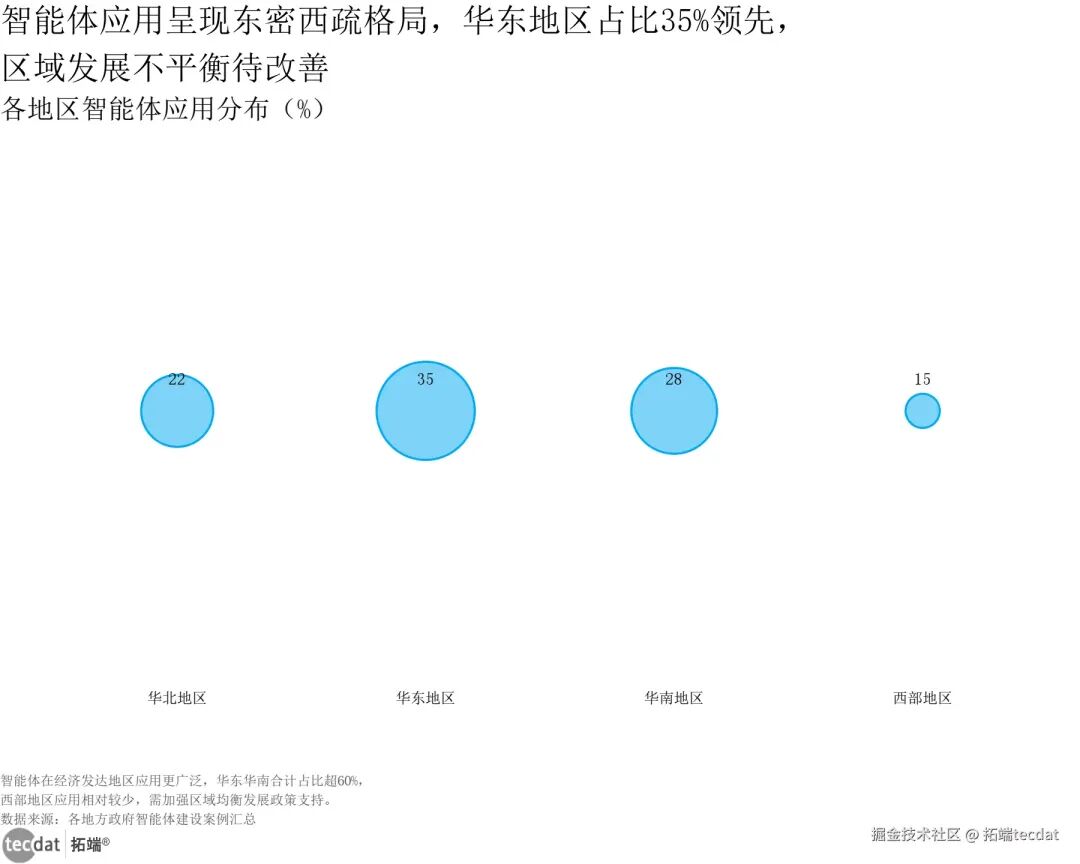 智能体在政务、金融、医疗、制造等重点行业快速落地,其中政务服务应用最为广泛,体现了政策驱动下AI技术在公共服务领域的优先应用,金融与医疗则受益于场景刚需。数据来源:中国信息通信研究院《政务智能体发展研究报告(2025年)》智能体行业应用圆环图表6数据EXCEL及图表PDF模板已分享到会员群3秒解读:政务服务占比40%,金融服务25%,医疗健康20%,制造业15%,政务是核心落地场景,金融与医疗为主要增长引擎。行动建议:政务信息化服务商可深耕本地政务智能体建设,拓展定制化需求,绑定政策红利;金融科技公司可与银行、保险机构合作,输出安全合规的智能体解决方案;医疗科技企业可聚焦病历分析、预约分诊等场景,开发专业化智能体产品。从区域分布看,智能体应用呈现“东密西疏”特征,区域发展不平衡问题突出,中西部存在补短板机会:【图表9:智能体区域分布气泡图】智能体应用呈现东密西疏格局,华东地区占比35%领先,区域发展不平衡待改善各地区智能体应用分布(%)