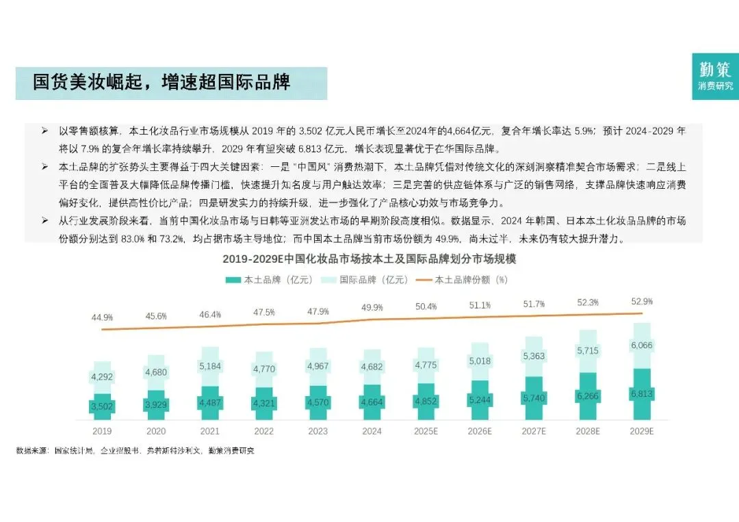 调研显示,2025 年中国化妆品行业正经历深刻变革,国货品牌以 55.2% 的市场份额坐稳主导地位,同比增长 2.9%,显著超越外资品牌。功效护肤赛道持续升温,复合成分搭配成为创新核心,美白、抗衰、头发护理三大领域逆势增长。