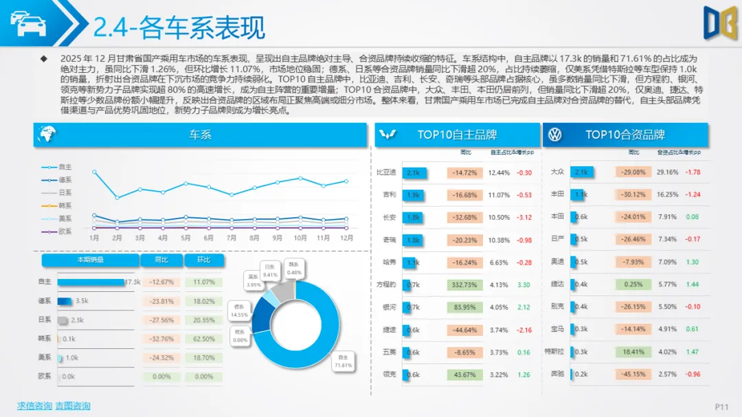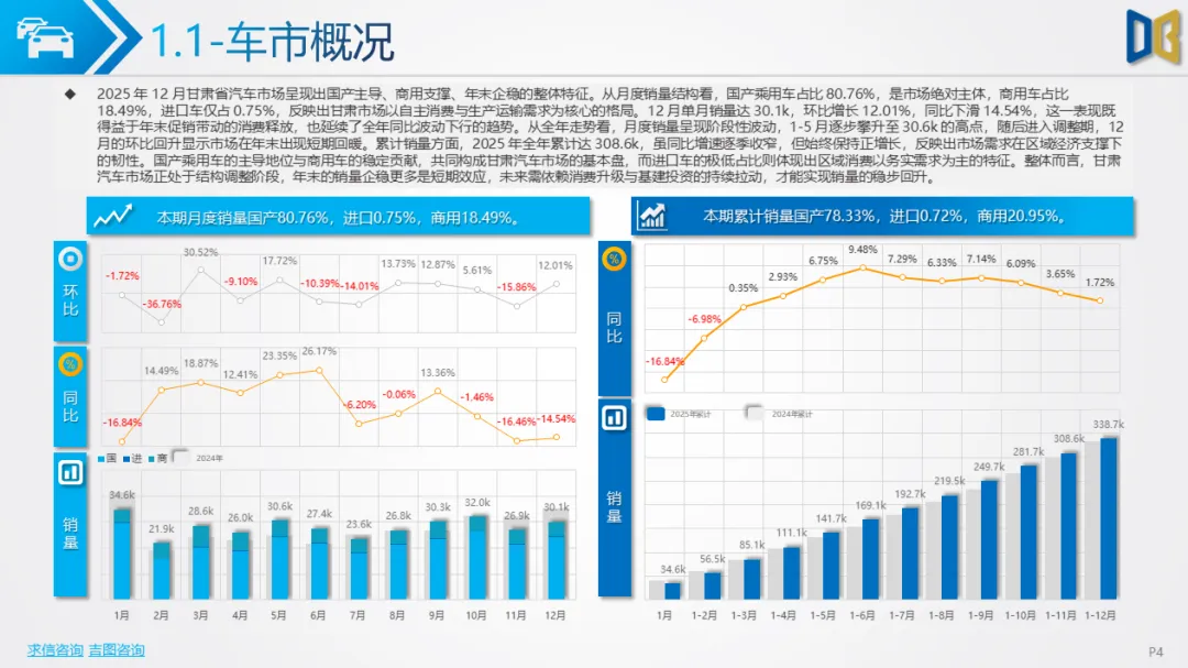 未来,甘肃汽车市场的发展将呈现三大趋势:自主新能源深化:自主车企将进一步扩大在新能源赛道的优势,合资燃油车型的份额或将持续压缩。商用车新能源提速:随着充电桩等配套设施完善,纯电动商用车的市场占比有望快速提升,物流场景的电动化将成为核心方向。进口车结构调整:进口车若想扭转颓势,需加速导入新能源车型与中端产品,降低对高端燃油车的依赖。整体而言,2025年12月的甘肃汽车市场,是自主崛起、新能源渗透与区域分化交织的缩影,市场结构的调整既反映了全国汽车产业的转型趋势,也契合了区域消费的务实需求。