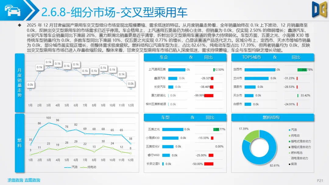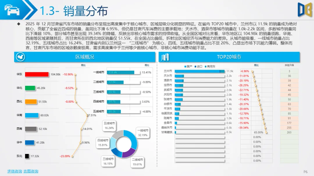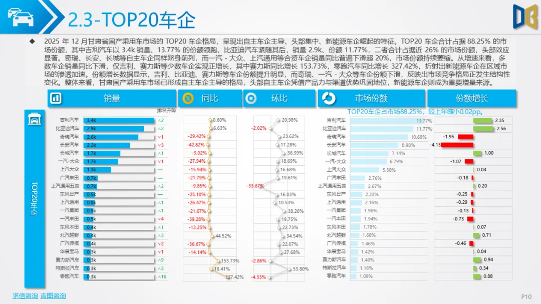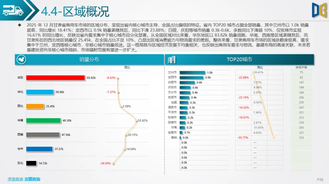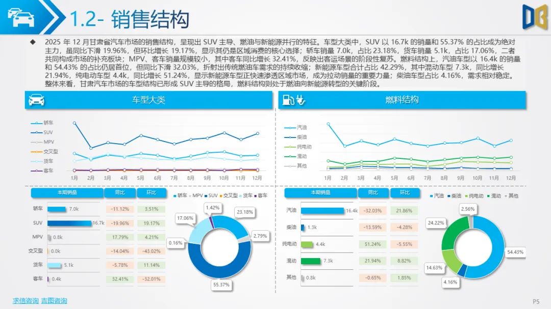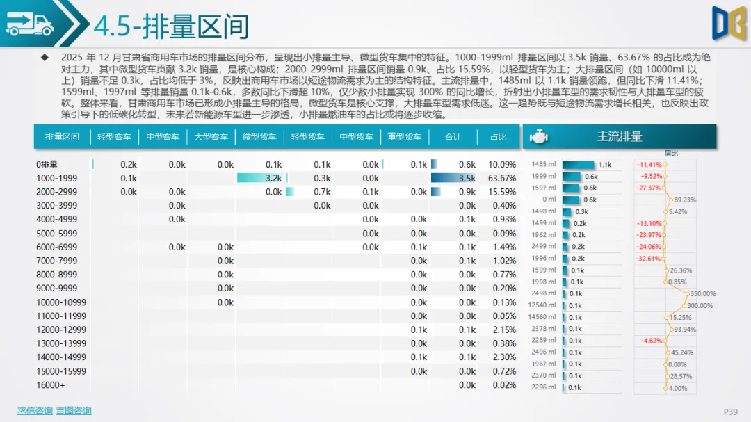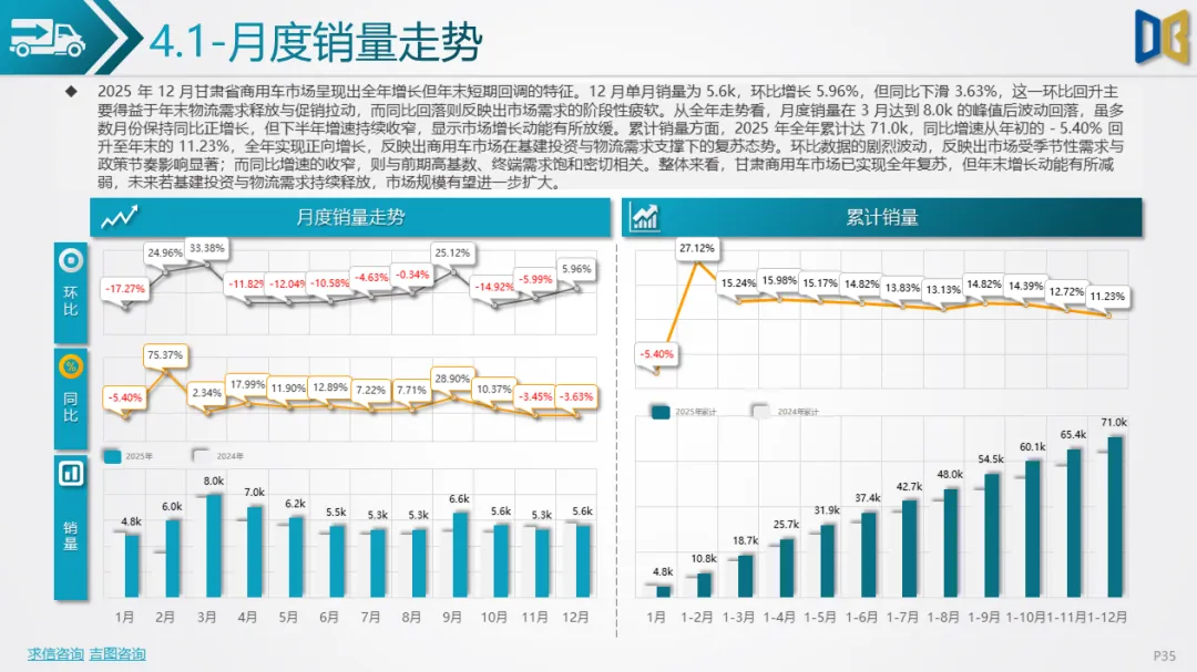 物流需求驱动,新能源加速渗透2025年12月,甘肃商用车市场呈现出 “货车主导、小排量核心、新能源崛起” 的特征,成为全省汽车市场的 “增长支撑”。车型结构:货车占比 92.30%,其中微型货车销量3.3k、同比增长超1000%,是核心增长动力;轻型货车销量1.1k,但同比下滑77.92%,反映出短途物流需求的旺盛与长途物流的阶段性疲软。燃料结构:汽油车型以3.0k销量、54.67%的占比主导,柴油车型占比21.66%;纯电动车型销量0.6k、同比增长89.23%,混合动力车型销量0.1k、同比增长533.33%,新能源车型的渗透速度加快,但燃料电池车型仍未实现零的突破。区域与品牌:销量集中于兰州、定西等核心城市,上汽通用五菱、长安等自主车企占据TOP20车企的81.39%份额,头部集中效应显著,同时中车时代电动等新能源车企实现1000%的同比增长,成为赛道新变量。全年来看,商用车累计销量达71.0k,同比增速从年初的- 5.40% 回升至11.23%,物流需求与政策引导共同推动市场复苏,新能源商用车的占比提升成为重要增长逻辑。