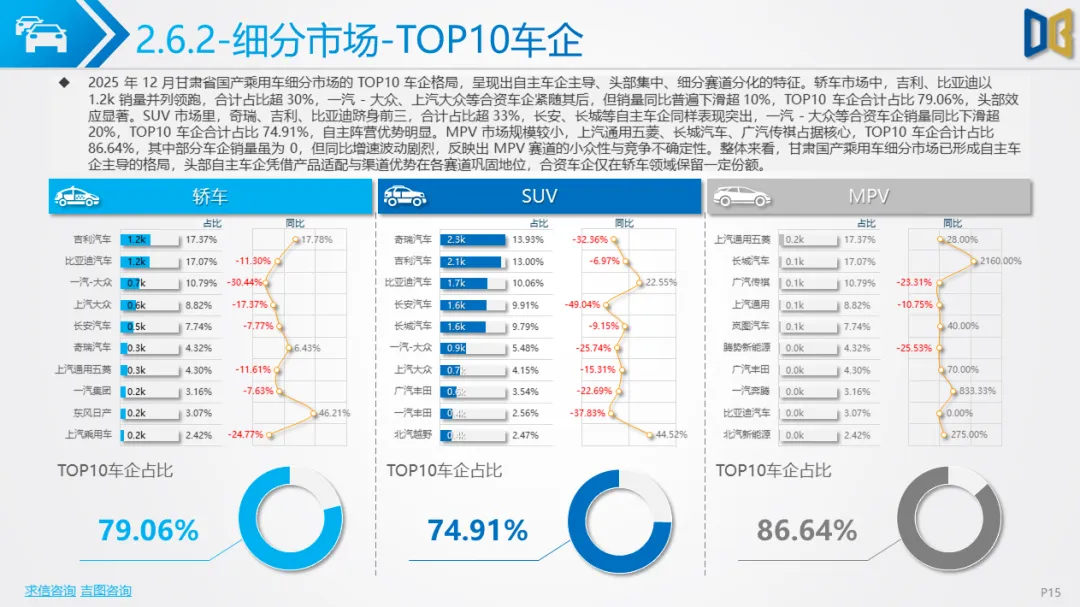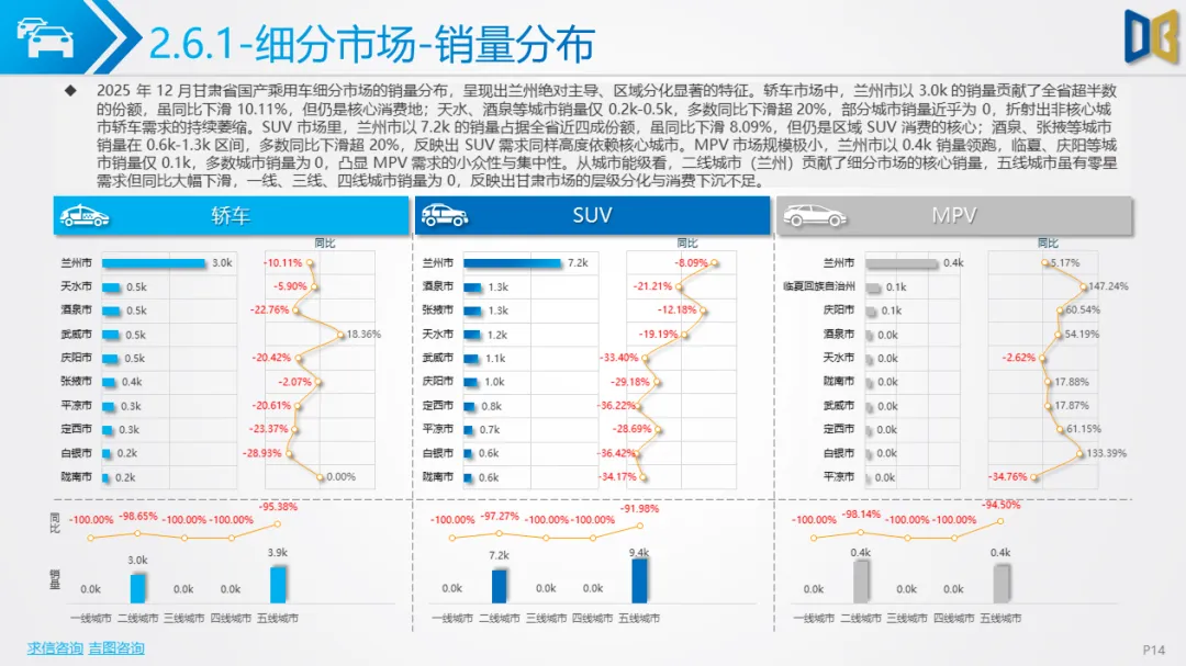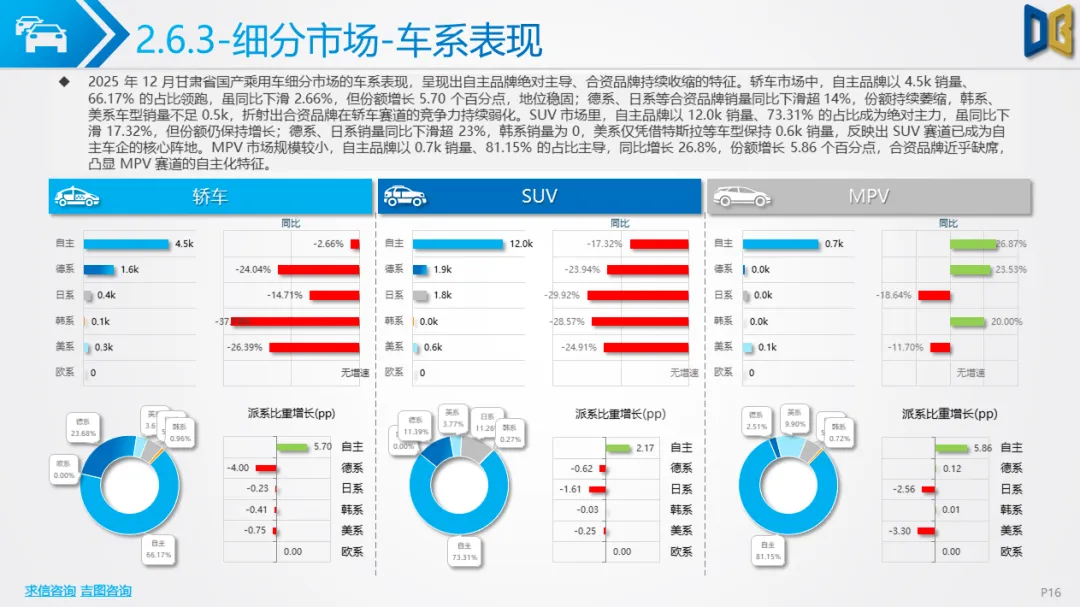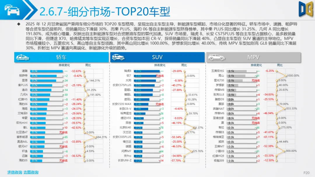 自主新能源崛起,合资燃油收缩2025年12月,甘肃国产乘用车市场已形成自主车型绝对主导的格局,细分市场呈现出 “新能源替代燃油、SUV领跑赛道” 的特征。轿车市场:速腾、帕萨特等合资车型虽仍居销量前列,但同比下滑超 30%;秦 PLUS、海豹06等自主新能源车型跻身TOP20,其中几何A同比增长191.80%,秦 PLUS同比增长31.25%,自主新能源对合资燃油的替代效应持续强化。SUV市场:瑞虎8、长安CS75PLUS等自主车型占据核心,虽多数销量同比下滑,但捷途X70、哈弗猛龙等车型实现正增长;本田CR-V、探岳等合资SUV销量同比下滑超40%,自主车型在SUV赛道的优势进一步巩固。MPV市场:五菱宏光S、高山等自主车型领跑,其中高山同比增长1000.00%,传统MPV车型如别克GL8销量同比下滑超30%,MPV赛道向高端化、新能源化升级的趋势凸显。整体来看,甘肃国产乘用车市场的自主化、新能源化进程已进入加速期,合资燃油车型的市场份额持续收缩,自主车企在产品力与渠道布局上的优势逐步转化为市场主导权。