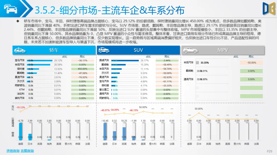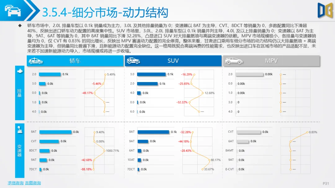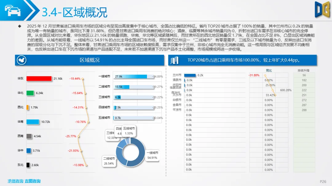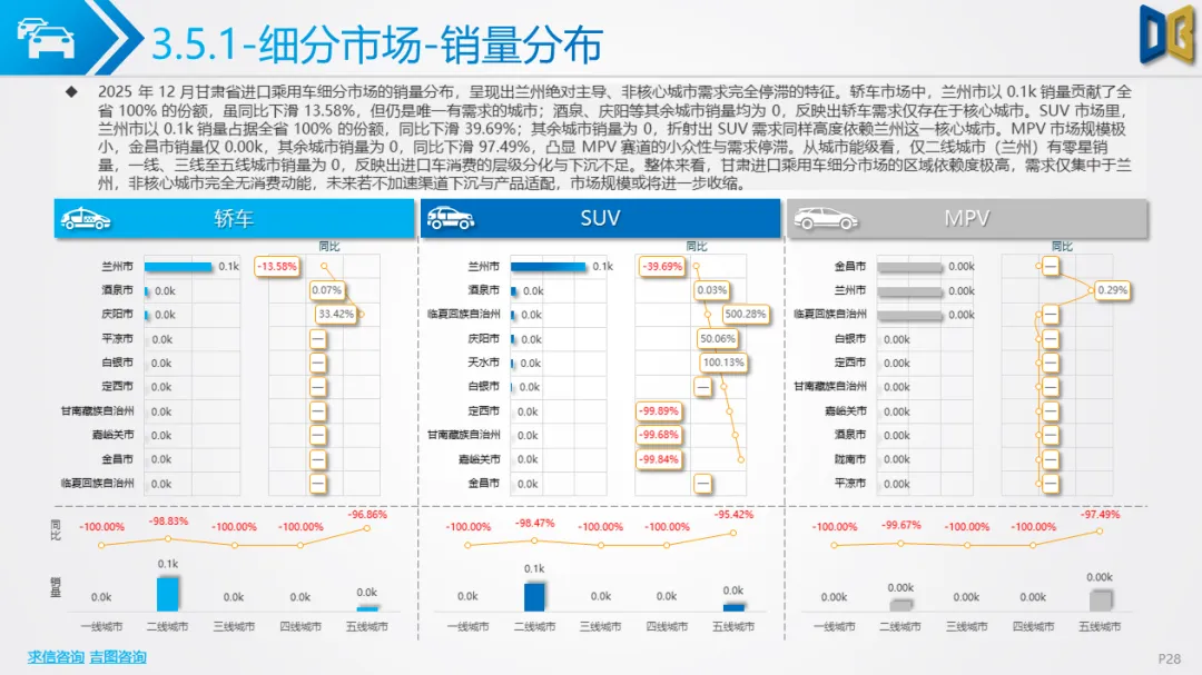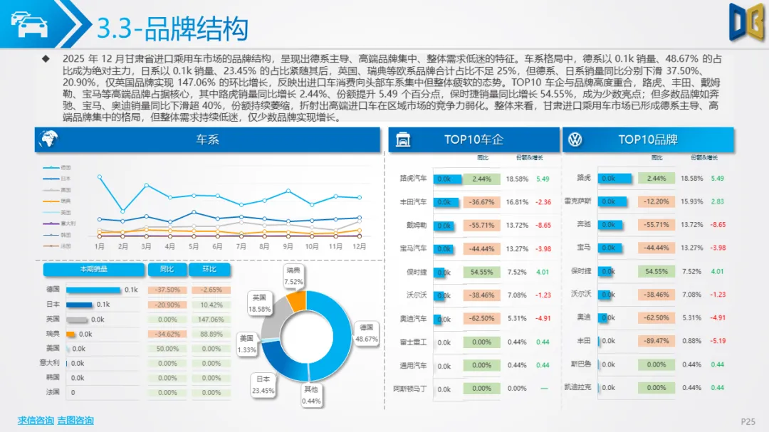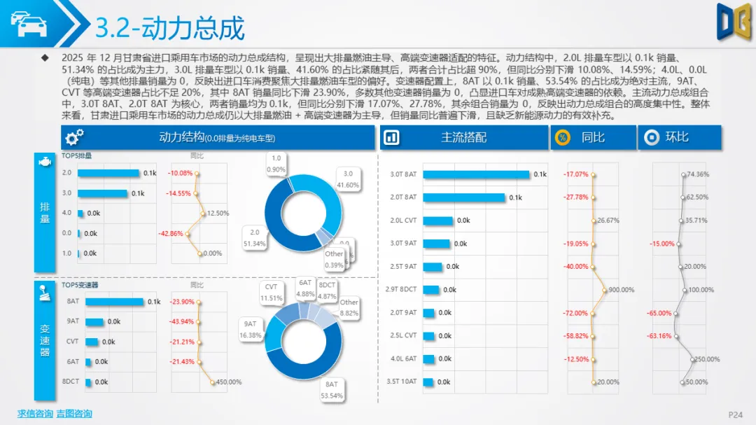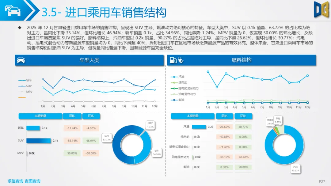 需求高度集中,市场持续低迷2025年12月,甘肃进口乘用车市场呈现出 “规模萎缩、核心城市依赖、产品结构单一” 的特征,成为全省汽车市场的 “弱势板块”。区域分布:需求完全集中于兰州市,其余城市销量为 0,兰州市12月销量0.2k,但同比下滑31.88%,非核心城市的进口车消费完全停滞。产品结构:以大排量燃油车型为主导,2.0L、3.0L排量车型合计占比超90%,8AT变速器占比53.54%,但纯电动、插电混动等新能源车型销量为0,产品结构与市场低碳化需求脱节。品牌格局:路虎、丰田、戴姆勒等高端品牌占据核心,但多数品牌销量同比下滑超40%,仅保时捷等少数品牌实现正增长,进口车的性价比劣势与产品适配不足问题凸显。从全年走势看,进口乘用车月度销量始终在0.2k上下低位波动,累计销量同比降幅稳定在20%左右,市场规模已进入存量收缩阶段,未来若不加速新能源车型导入,份额或将进一步萎缩。