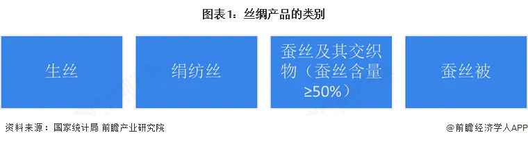 广义的丝绸涵盖整体产业链中的“桑、蚕、茧、丝、绸、成品”。现代所述丝绸一般指以蚕茧为原料,经过缫丝、织造、染整、印花等一系列(或部分)步骤制成的纺织品的总称。根据国家统计局分类标准,主要丝绸产品为生丝、绢纺丝、蚕丝及其交织物(蚕丝含量≥50%)和蚕丝被4种。