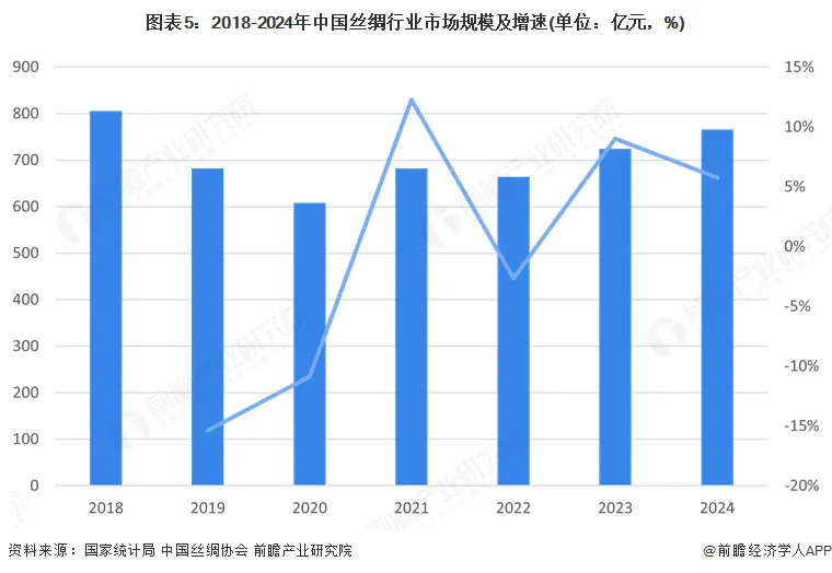 据国家统计局统计,2024年全国丝绸行业规模以上企业主营业务收入同比增长5.75%,前瞻初步核算2024年中国丝绸行业市场规模达765.85亿元。