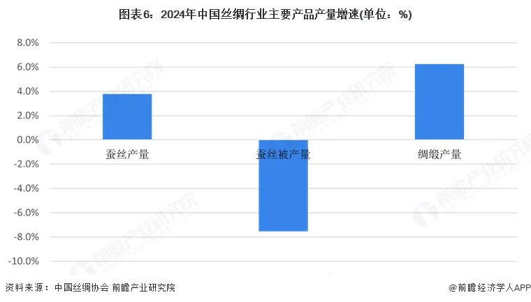 2024年,全国规模以上丝绸企业蚕丝产量同比增长3.79%,缎产量同比增长6.25%,蚕丝被产量同比下降7.53%。