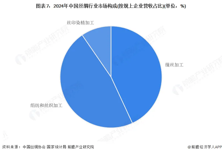 从销售构成角度上看,国内丝纺织行业主要包括缫丝加工、绢纺和丝织加工、丝印染精加工三大类,其中,绢纺和丝织加工行业规上企业营收规模最大。经测算,2024年绢纺和丝织加工行业规上企业营收同比增长2.6%,占比丝纺织行业规上企业总营收的43%;缫丝加工行业2024年规上企业营收同比增长11.36%,占比丝纺织行业47%;丝印染精加工市场规模最小,2024年行业规上企业营收同比2023年下降1.4%,占比10%。