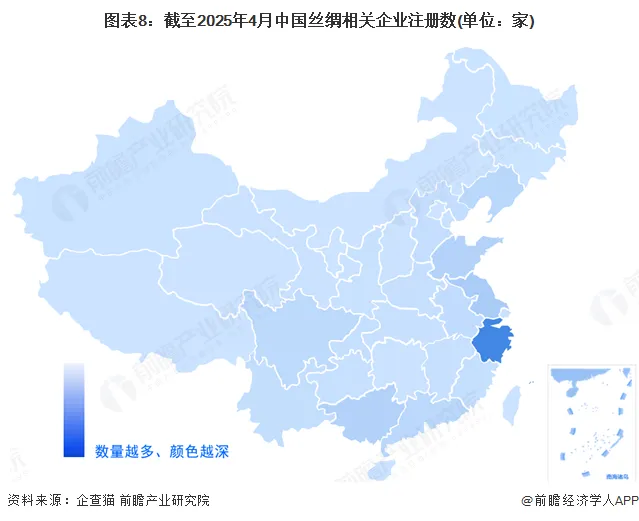 通过企查猫,检索“丝绢纺织及印染精加工(国标代码:C174)”行业、登记状态为“存续/在业”的企业,截至2025年4月27日,中国相关企业有3673家,从丝绸产业链代表性企业的区域分布情况来看,主要分布在江浙与广西地区,浙江省内丝绸业企业数量达1488家,排名全国第一,该省丝绸企业数量占比全国近四成;江苏排名第二位,有超300家丝绸制造企业;广西集聚着上游蚕丝生产的企业。