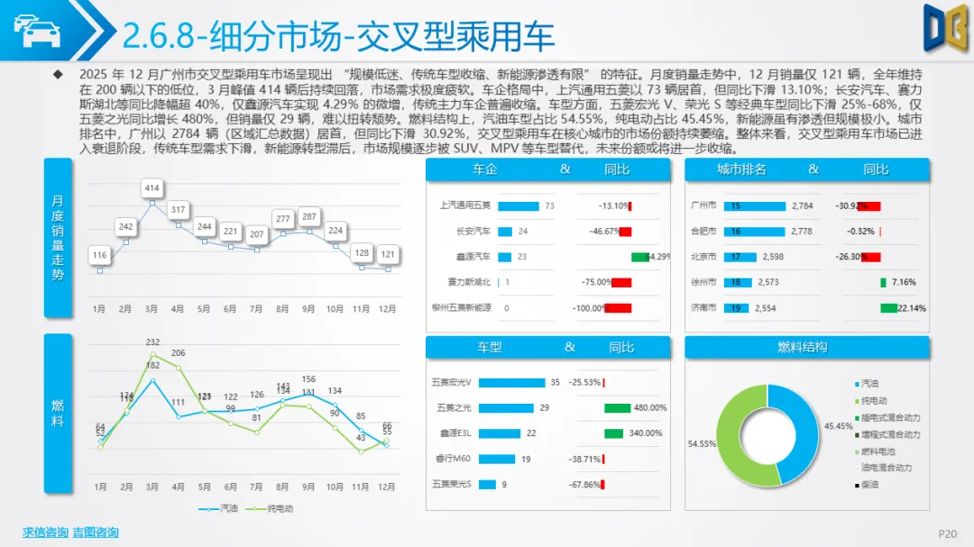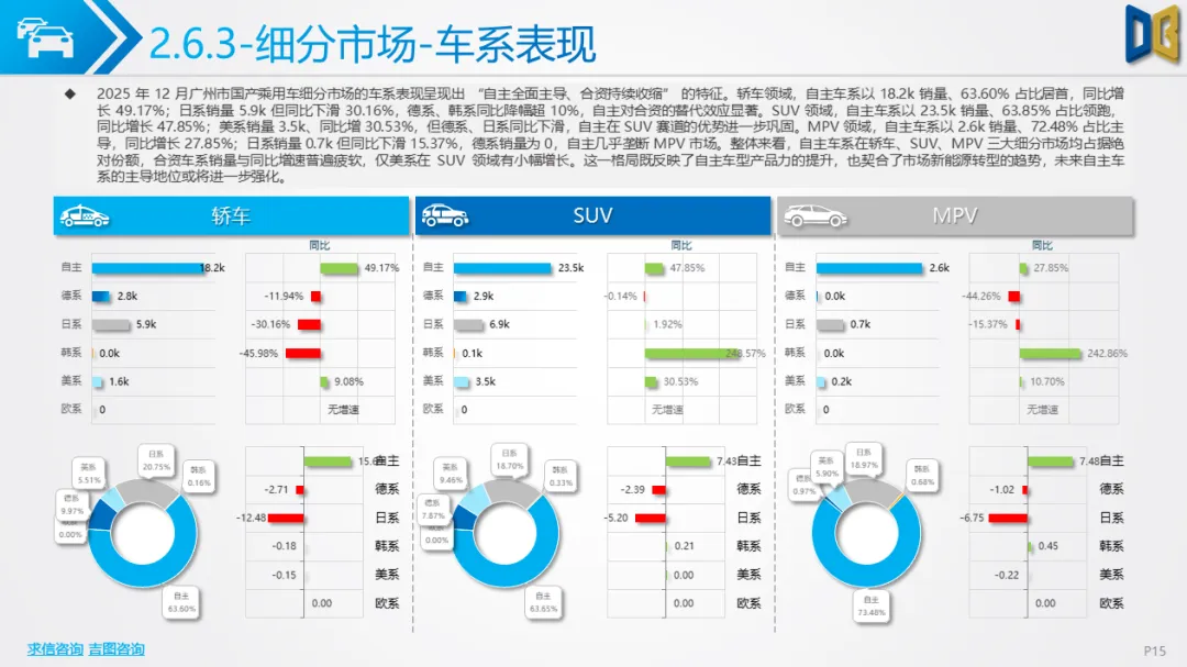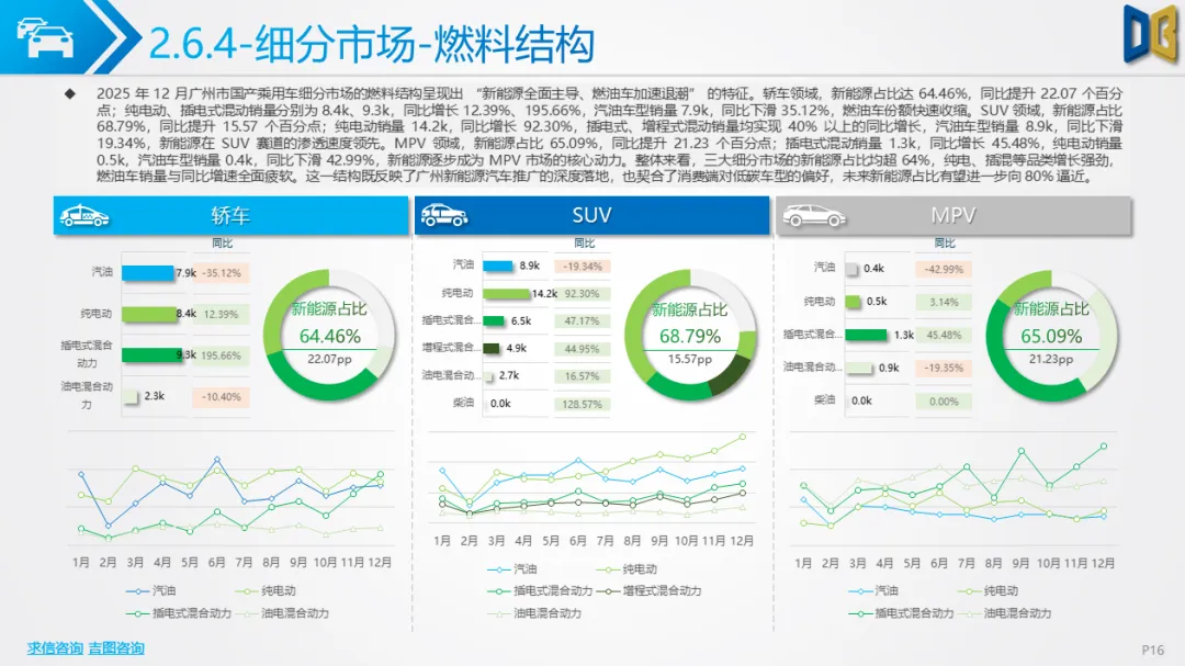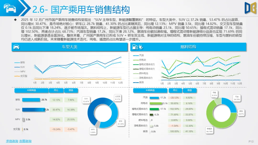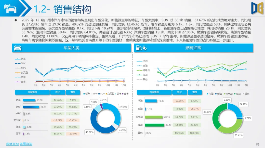 自主崛起,新能源全面主导国产乘用车市场是广州车市的核心增长引擎,12 月销量 69.6k,环比增长 13.11%,同比增长 21.31%,全年累计销量 608.6k,同比增速回升至 14.20%。从月度走势看,销量在 2 月触底 23.2k 后逐步回升,年末达到峰值,虽期间多次出现环比下滑,但整体复苏态势明确。车型结构上,SUV 以 37.2k 销量、53.47% 占比成为绝对主力,同比增长 30.47%;轿车以 28.7k 销量、41.30% 占比紧随其后,同比增长 12.13%;MPV 销量 3.5k,同比增长 14.82%,而交叉型车型销量仅 0.1k,同比下滑 18.24%,逐步被市场淘汰。