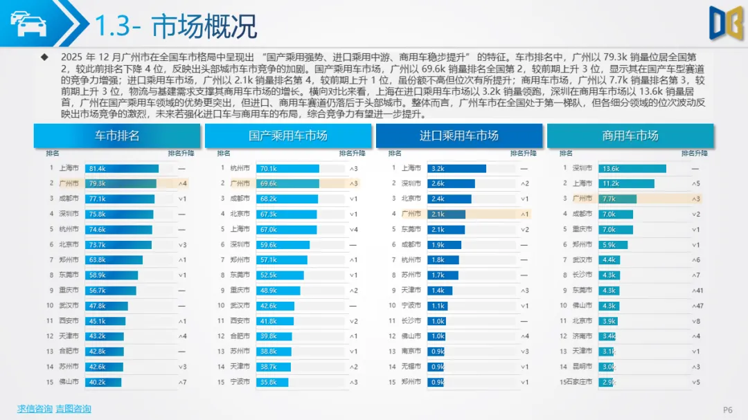 在全国车市格局中,广州以79.3k 销量位居全国第 2,虽排名有所下降,但仍处于第一梯队。细分领域表现分化,国产乘用车销量排名全国第2,竞争力持续增强;进口乘用车排名第 4,商用车排名第 3,均有位次提升,但与上海、深圳等头部城市仍有差距。未来,广州汽车市场将呈现三大趋势:一是国产乘用车的主导地位进一步巩固,新能源车型占比有望向80% 逼近,自主车企的市场掌控力持续提升;二是进口乘用车若不加速新能源车型导入和动力升级,市场规模或将进一步萎缩,市场集中度向少数日系高端品牌集中;三是商用车市场将持续受益于基建与物流需求回暖,新能源转型深入推进,零排量车型占比进一步提升。整体来看,广州车市需强化进口车与商用车的布局,以提升综合竞争力,巩固在全国第一梯队的地位。