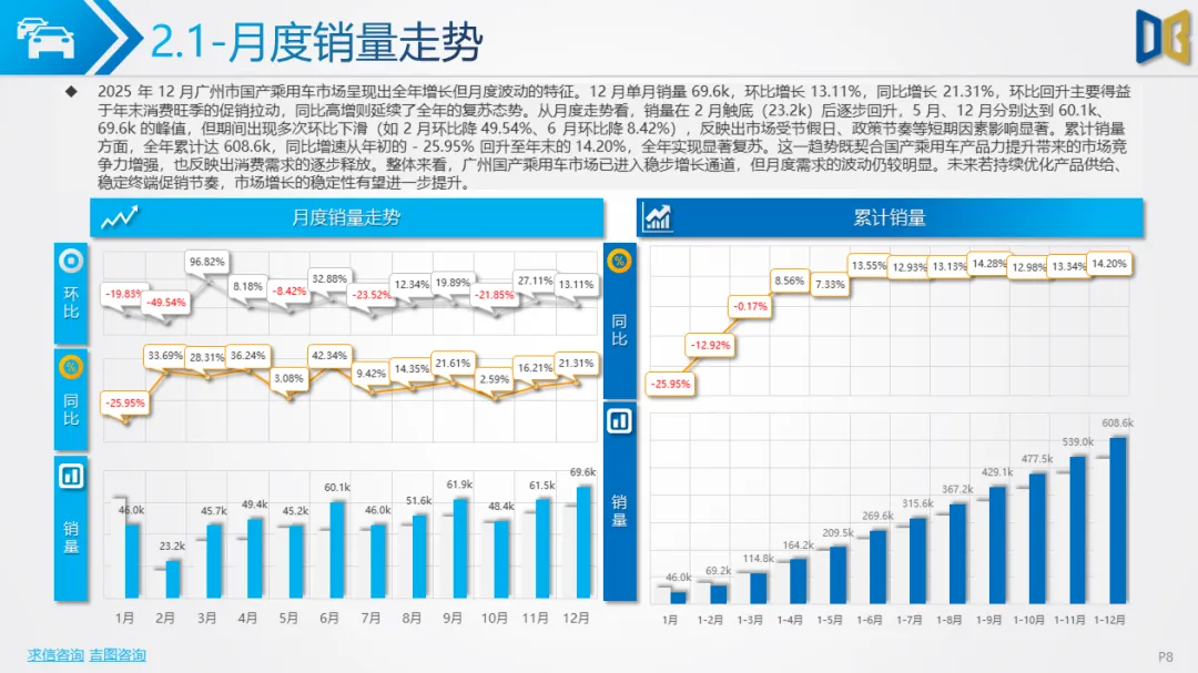 2025 年 12 月,广州市汽车市场呈现出 “国产主导、新能源引领、细分市场分化” 的鲜明特征,在全国车市竞争中稳居第一梯队。整体市场规模稳步扩张,全年累计销量达 711.9k,同比增速从年初的 - 10.47% 回升至年末的 16.41%,实现显著复苏。12 月单月销量 79.3k,环比增长 11.85%,同比增长 23.06%,虽增速较前期收窄,但仍彰显出市场的坚实韧性。