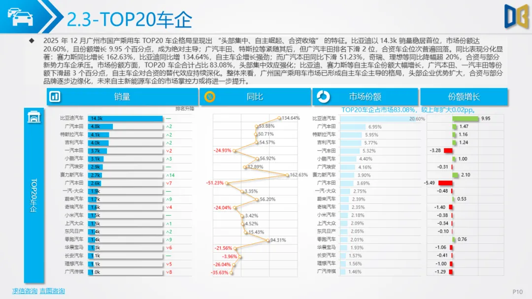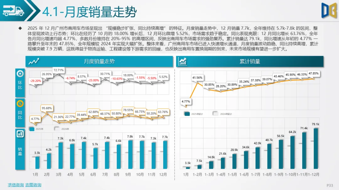 快速增长,新能源与基建双轮驱动商用车市场进入快速增长通道,12 月销量 7.7k,全年维持在 5.7k-7.8k 区间,呈现波动上行态势。全年累计销量 79.1k,同比增速攀升至 47.85%,显著高于整体车市增速,成为广州车市的重要增长极。车型结构以货车为主导,占比 78.88%,其中轻型货车以 2.8k 销量居首,重型货车销量 2.3k,同比暴涨 330.65%,反映出工程运输需求的强劲复苏;微型货车同比增长超 100%,城市配送需求旺盛。客车占比 21.12%,轻型客车和中型客车同比分别增长 29.95%、496.94%,客运市场逐步回暖。燃料结构转型成效显著,纯电动车型以 5.0k 销量、64.57% 占比主导,同比增长 71.24%;燃料电池车型销量 778 辆,占比 10.14%,展现出政策推动下的增长潜力;柴油车型仍为传统燃料主力,汽油、CNG 车型销量下滑明显。车企与品牌格局呈现 “头部集中、新能源主导” 特征,江西吉利新能源商用车、远程品牌等领跑市场,多数头部品牌同比增幅超100%,中小品牌加速出清。在全国排名中,广州商用车销量位居第 3,较前期上升 3 位,物流与基建需求成为核心支撑。