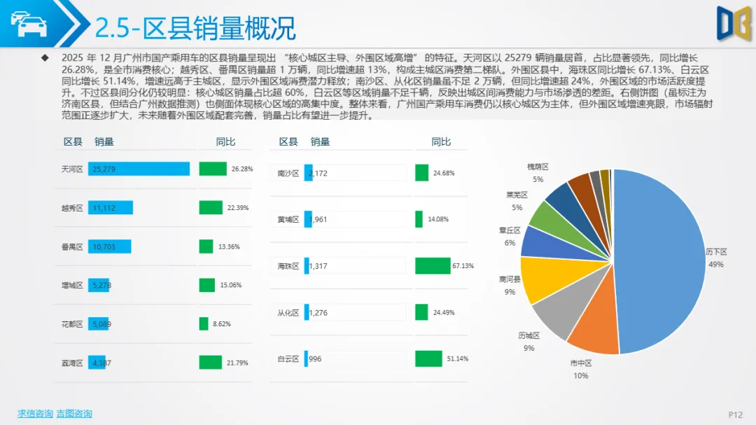 燃料结构的转型更为彻底,新能源车型合计占比 68.73%,其中纯电动销量 23.1k,同比增长 50.65%,插电式混动销量 17.1k,同比激增 102.50%;汽油车型销量 17.2k,同比下滑 28.12%,燃油车份额加速收缩。动力总成呈现 “小排量 + 纯电主导、简单变速器偏好” 特征,1.5L 排量以 29.4k 销量居首,同比增长 32.95%,0.0L(纯电)排量销量 23.1k,同比增长 50.65%;变速器方面,1AT 和 CVT 合计占比超 80%,复杂变速器需求持续收缩。车企格局上,头部集中效应显著,比亚迪以 14.3k 销量、20.60% 份额稳居首位,赛力斯、零跑等自主车企同比增速迅猛,而合资车企普遍下滑,自主对合资的替代效应持续深化。区县消费呈现 “核心城区主导、外围区域高增” 特征,天河区为消费核心,海珠、白云等外围区县增速亮眼,市场辐射范围逐步扩大。