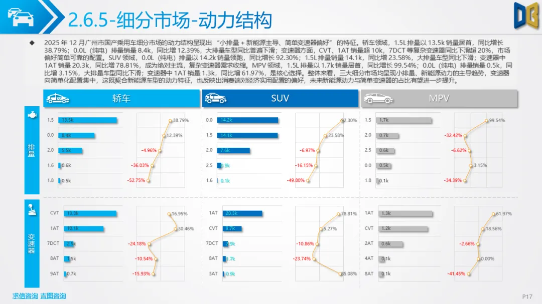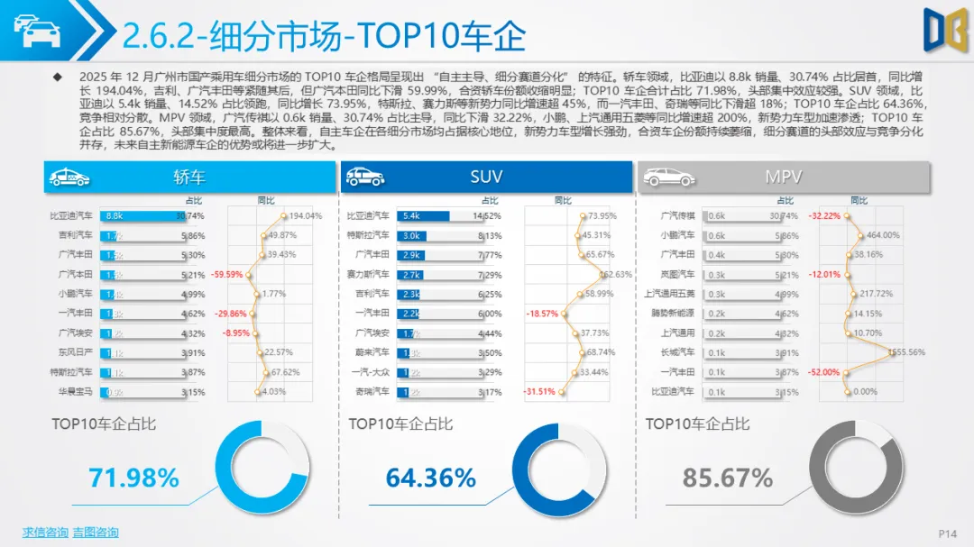 市场结构上,国产车型占比 87.68%,进口车型占比 2.65%,商用车占比 9.67%,国产车型已成为绝对核心,而月度销量的剧烈波动(如 2 月环比下滑 44.00%、11 月环比下滑 19.80%)则反映出市场受节假日、促销节点等短期因素影响显著。