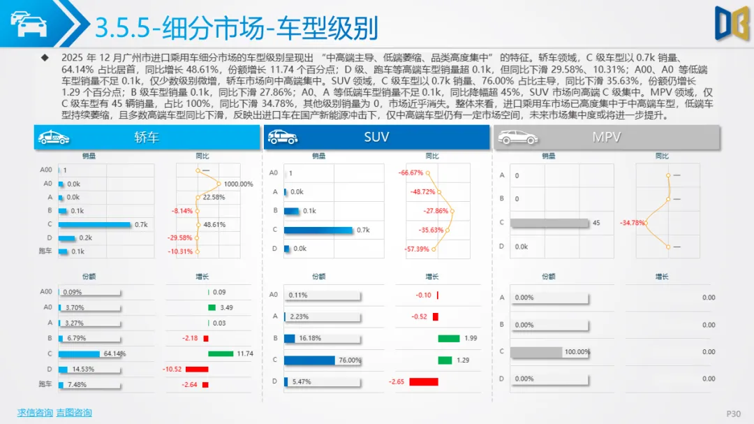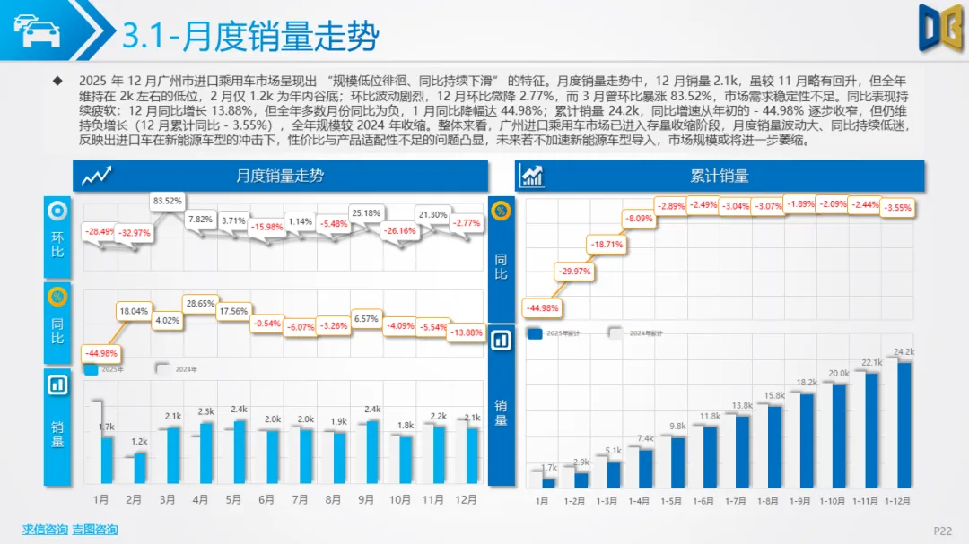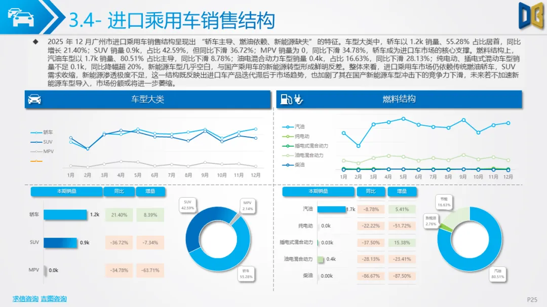 规模收缩,结构转型滞后进口乘用车市场持续处于存量收缩阶段,12 月销量 2.1k,虽较 11 月略有回升,但全年维持在 2k 左右低位,2 月仅 1.2k 为年内谷底。全年累计销量 24.2k,同比仍为负增长,反映出进口车在国产新能源冲击下的竞争力不足。品牌结构呈现 “日系主导、德系收缩” 特征,日本车系以 1.1k 销量、52.38% 占比居首,丰田汽车和雷克萨斯品牌成为绝对核心,同比微增;德国车系以 0.8k 销量、37.40% 占比次之,但同比下滑 27.06%,其他车系销量规模极小且普遍下滑。