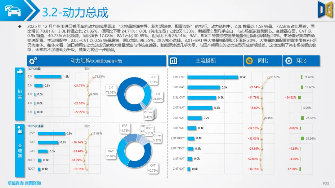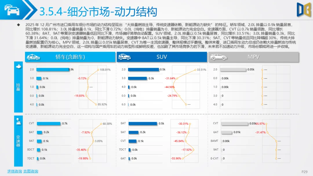 车型结构上,轿车以 1.2k 销量、55.28% 占比成为核心支撑,同比增长 21.40%;SUV 销量 0.9k,同比下滑 36.72%;MPV 市场近乎萎缩。燃料与动力结构转型严重滞后,汽油车型占比 80.51%,新能源车型占比不足 4%,纯电车型几乎空白,与国产乘用车的新能源转型形成鲜明反差。动力总成仍依赖大排量燃油,2.0L 排量占比 72.58%,变速器以 CVT 和 8AT 为主,复杂变速器需求收缩。在全国格局中,广州进口乘用车销量排名第 4,落后于上海等头部城市,市场竞争力有待提升。