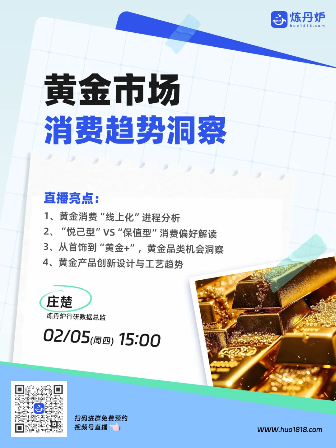 当黄金消费开始向婚庆、悦己、赠礼、资产配置等多元化场景不断延伸,品牌又该如何在同质化竞争中突围,复刻老铺黄金们的增长路径❓2月5日(周四)15:00 ,炼丹炉行研数据总监庄楚,将基于对黄金市场消费行为的数据拆解、竞争格局分析及未来发展趋势预判,聚焦消费端真实需求与行为变化,拆解不同场景下的消费特征、品类偏好与营销策略,把握“掘金”先机。
