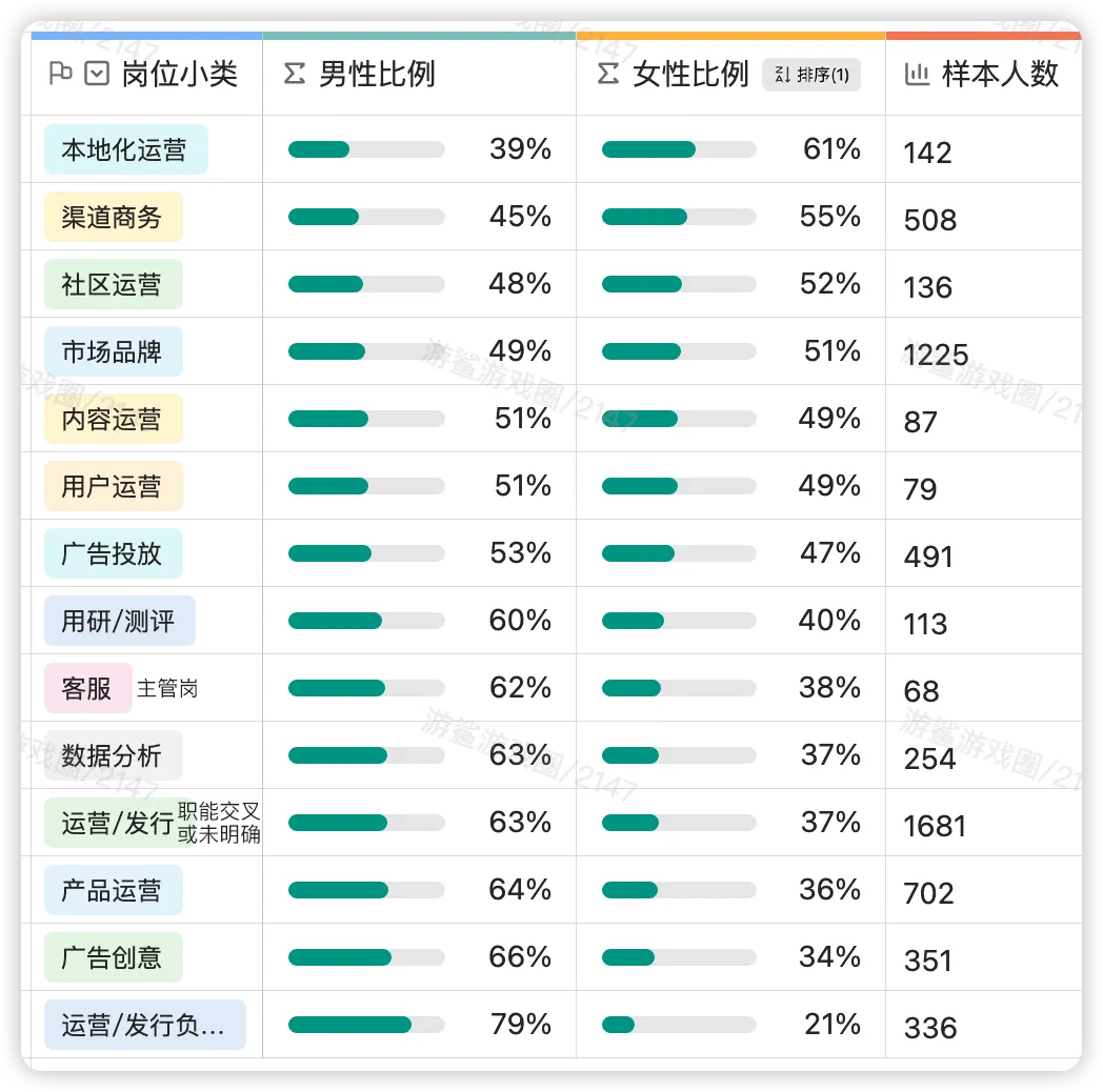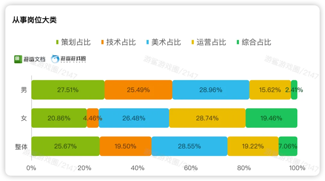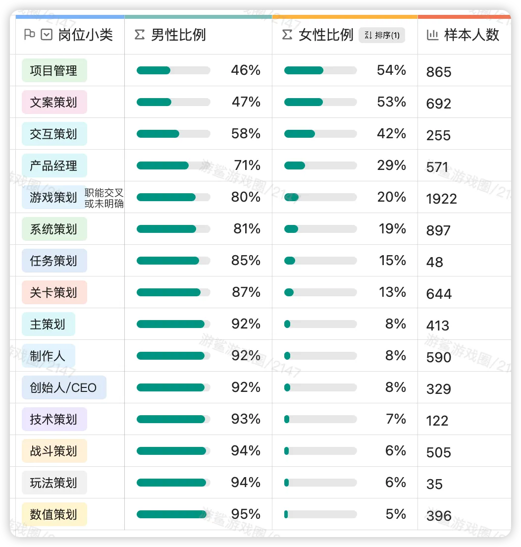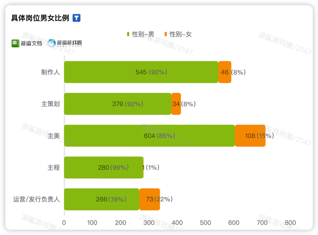 数值、战斗、技术、关卡策划,以及制作人、主策划等岗位,在样本中以男性为主。