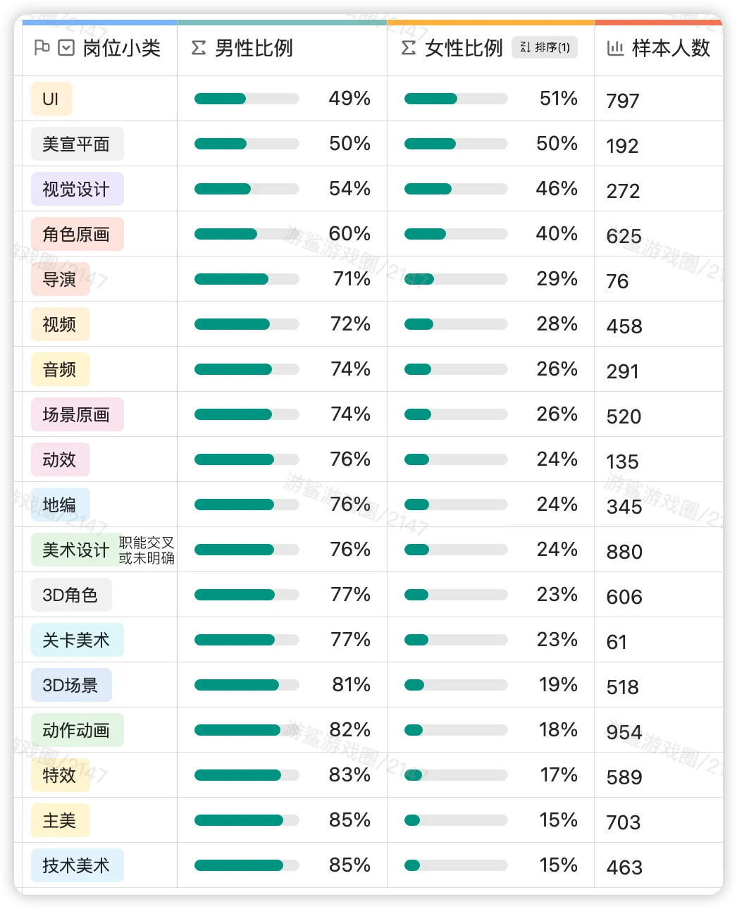 技术美术(TA)、特效、动作动画、3D场景/角色及主美岗位,在样本中男性占比相对更高。