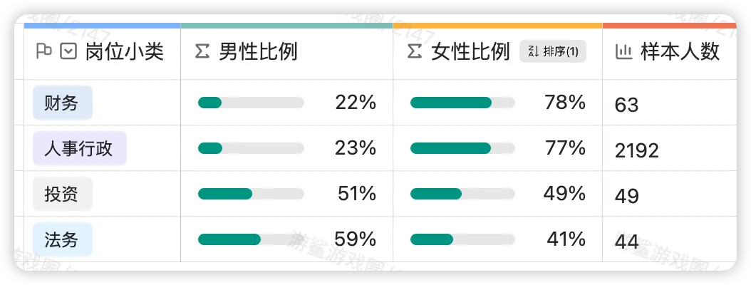 从公开履历路径观察,不少制作人具有主策划背景,而主策划中系统与数值方向从业者较多,这些方向在样本中女性占比相对较低,因此制作人和主策划岗位呈现出上述分布特征。