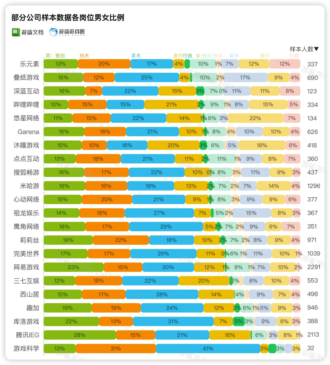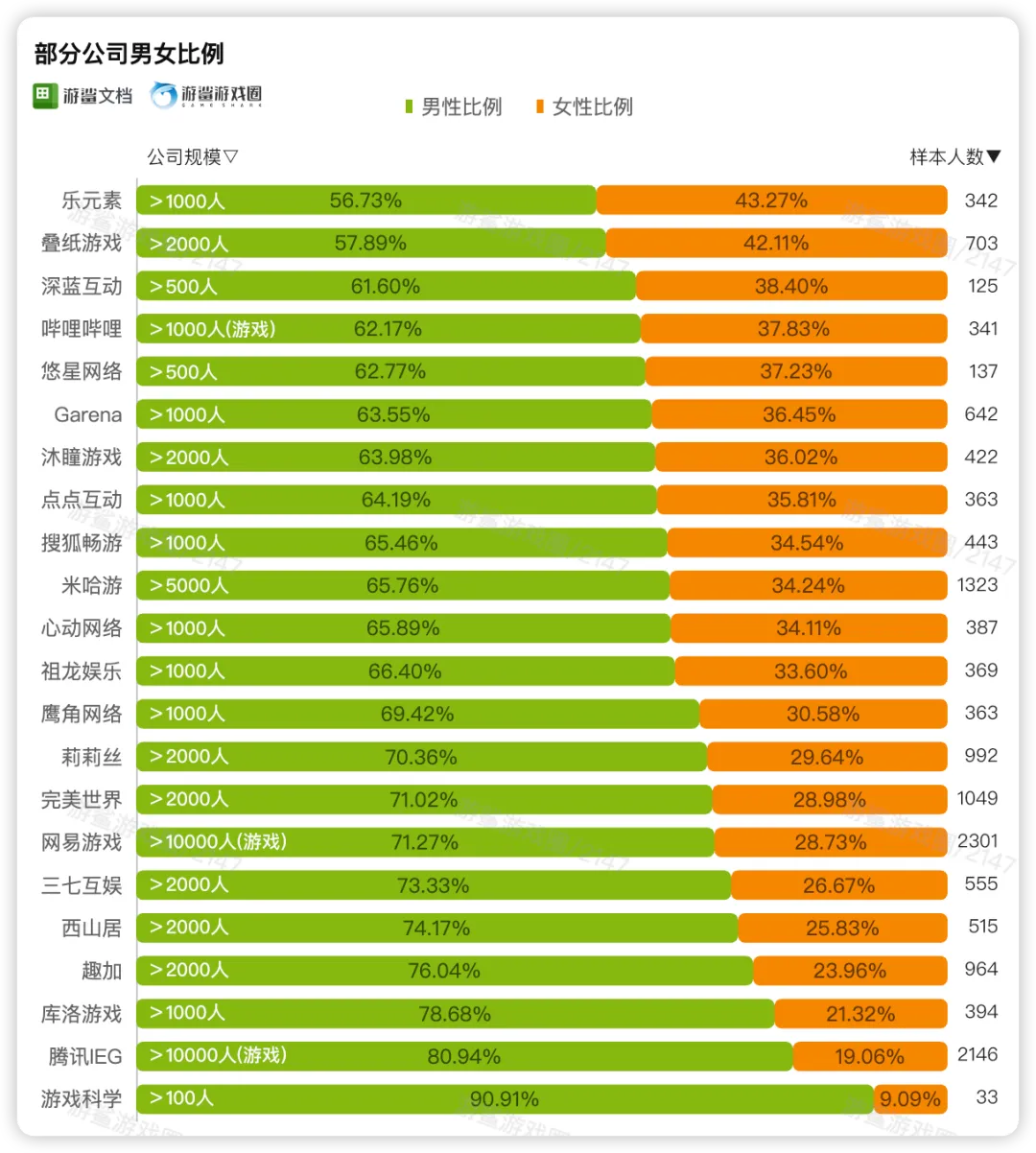 样本人数较多的公司里,乐元素、叠纸、深蓝、B站、悠星的女性员工比例相对较高。