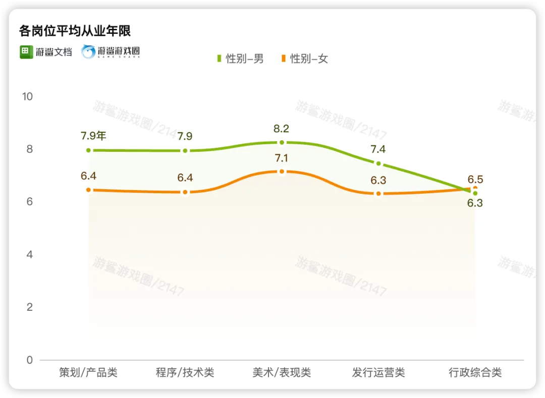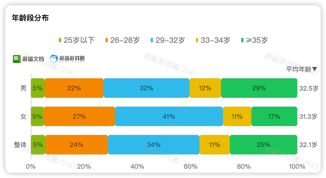 样本中女性从业者平均年龄约31.3岁,平均从业年限6.6年;男性约32.5岁,平均从业年限7.9年。(从业年限指从事游戏行业的年限)