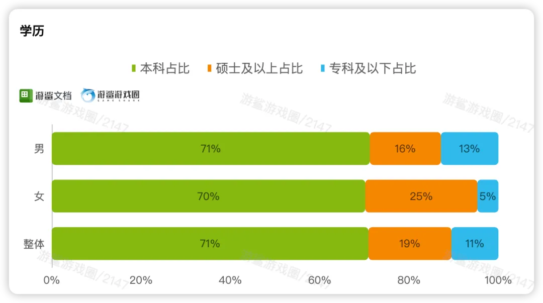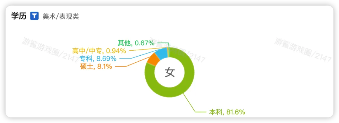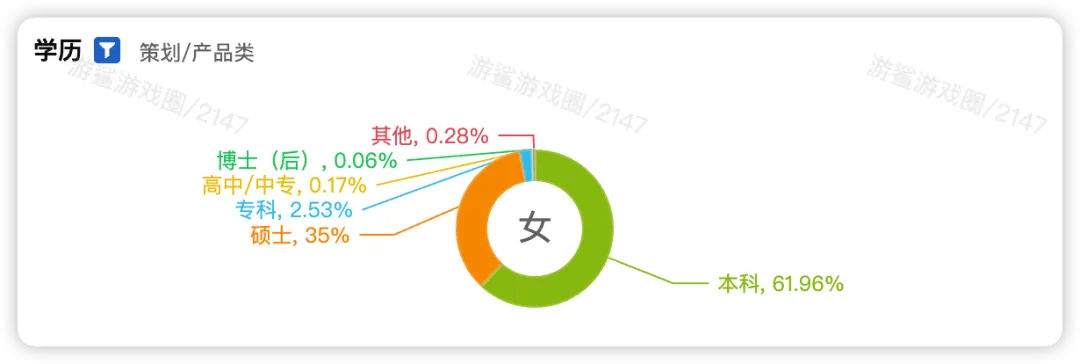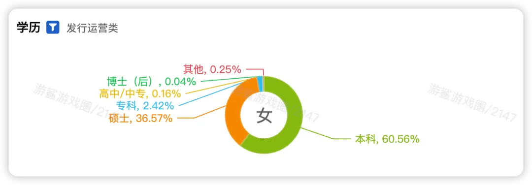 整体来看,在策划、发行运营及美术岗位样本中,女性学历分布相对更高。