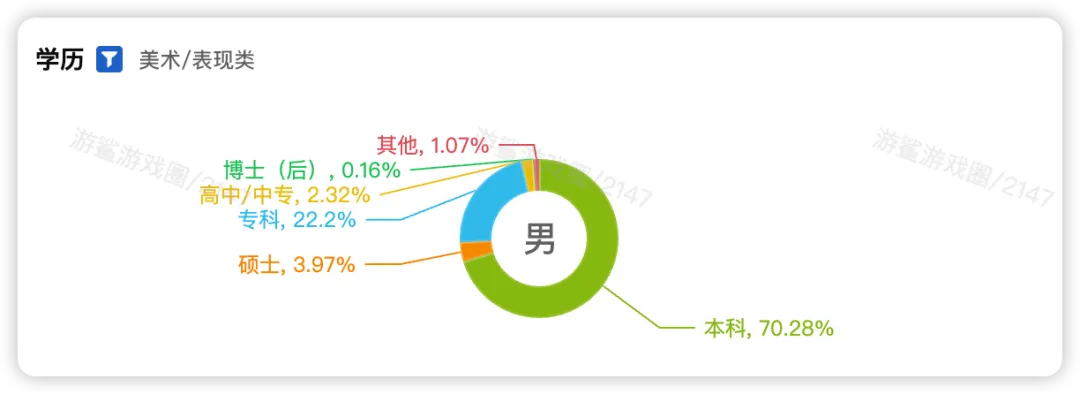 美术/表现类岗位,女性从业者本科占比超过80%,男性约为70%;男性从业者专科比例为22%,女性约为9%。