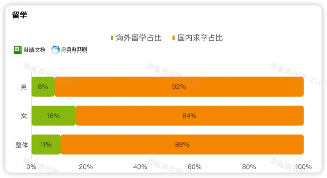 样本中女性留学经历占比约16%,男性约8%。女性硕士样本中约64%具有留学经历,男性约39%。