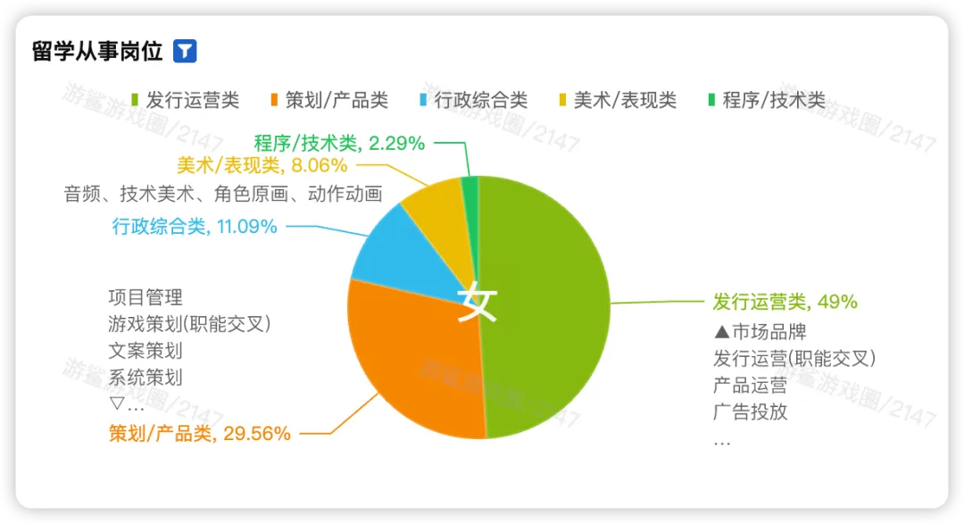 女性留学样本更多分布在发行运营(约49%)与策划产品类岗位(约30%)
