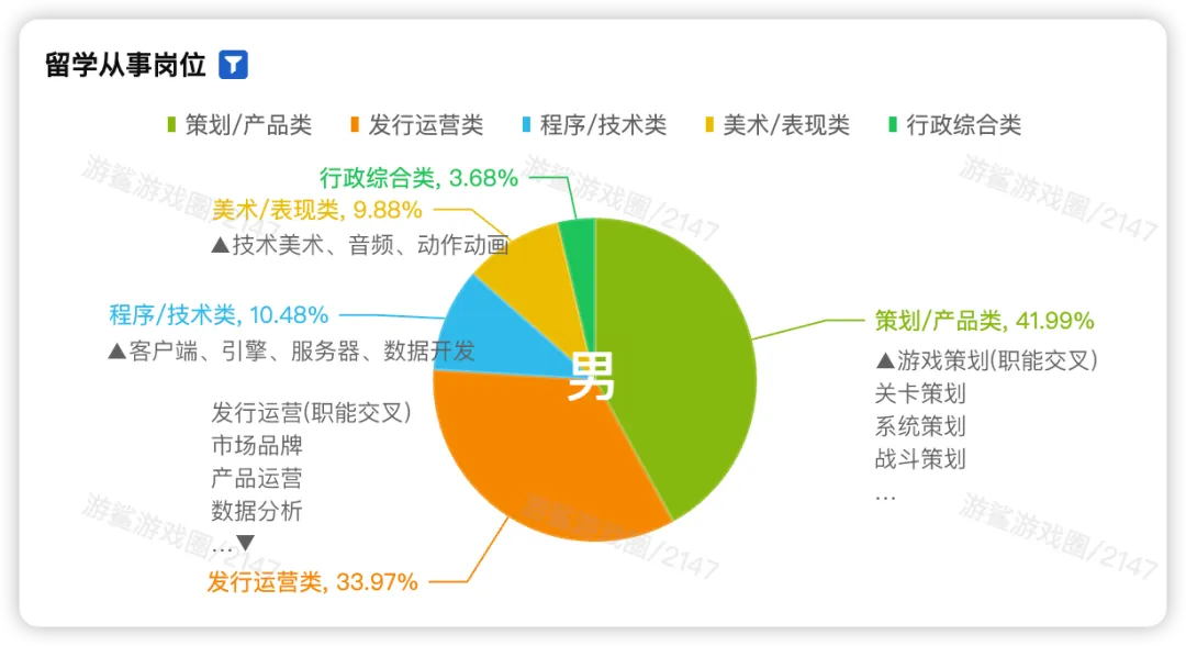 男性留学样本主要分布在策划产品(约42%)与发行运营(约34%)