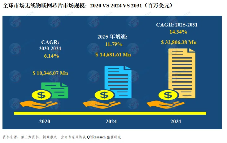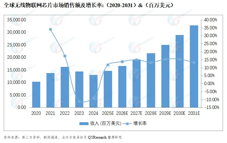 2024年,全球无线物联网芯片市场销售额达到了13,132.96百万美元,预计2031年将达到32,806.38百万美元,年复合增长率(CAGR)为14.34%(2025-2031)。