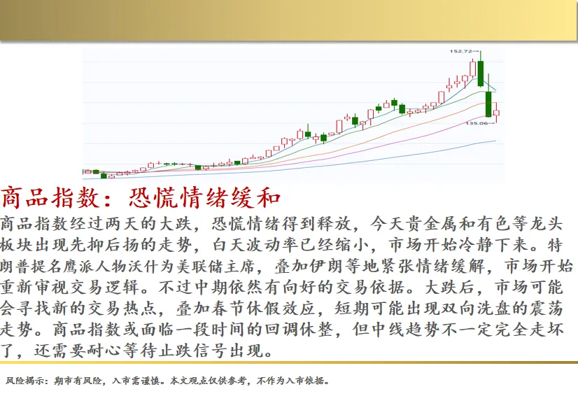 商品指数经过两天的大跌,恐慌情绪得到释放,今天贵金属和有色等龙头板块出现先抑后扬的走势,白天波动率已经缩小,市场开始冷静下来。特朗普提名鹰派人物沃什为美联储主席,叠加伊朗等地紧张情绪缓解,市场开始重新审视交易逻辑。不过中期依然有向好的交易依据。大跌后,市场可能会寻找新的交易热点,叠加春节休假效应,短期可能出现双向洗盘的震荡走势。商品指数或面临一段时间的回调休整,但中线趋势不一定完全走坏了,还需要耐心等待止跌信号出现。