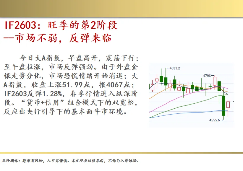 今日大A指数,早盘高开,震荡下行;至午盘拉涨,市场反弹强劲。由于外盘金银走势分化,市场恐慌情绪开始消退;大A指数,收盘上涨51.99点,报4067点;IF2603反弹1.28%,春季行情进入纵深阶段。“货币+信用”组合模式下的双宽松,反应出央行引导下的基本面牛市环境。