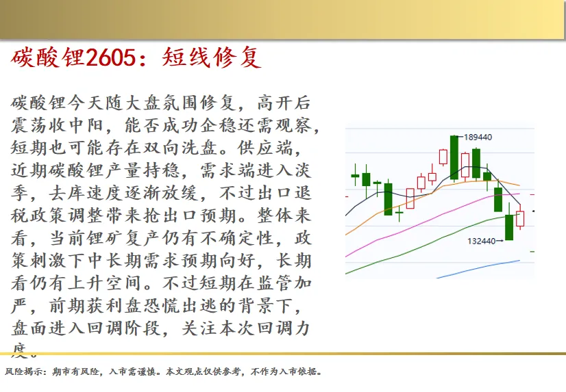 碳酸锂今天随大盘氛围修复,高开后震荡收中阳,能否成功企稳还需观察,短期也可能存在双向洗盘。供应端,近期碳酸锂产量持稳,需求端进入淡季,去库速度逐渐放缓,不过出口退税政策调整带来抢出口预期。整体来看,当前锂矿复产仍有不确定性,政策刺激下中长期需求预期向好,长期看仍有上升空间。不过短期在监管加严,前期获利盘恐慌出逃的背景下,盘面进入回调阶段,关注本次回调力度。