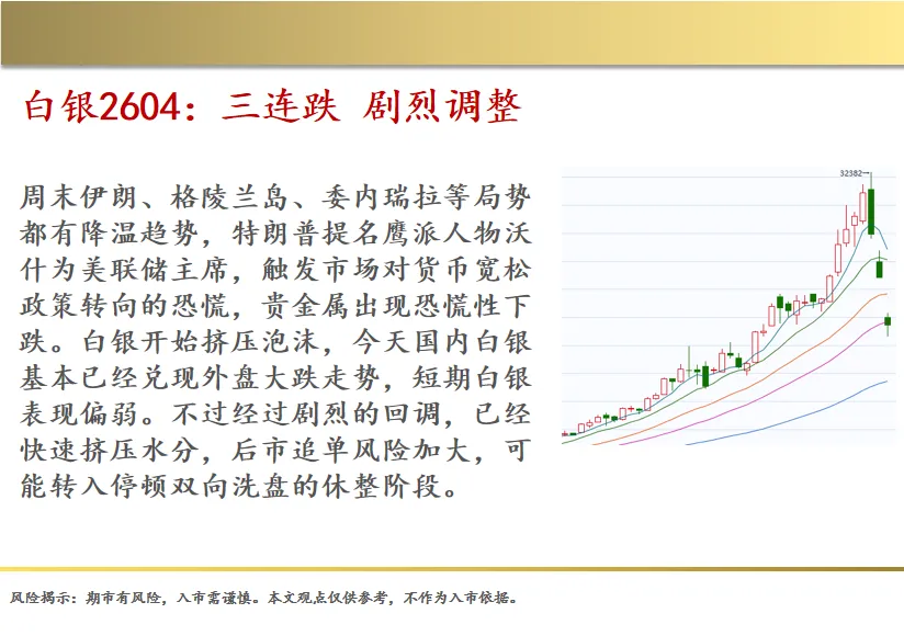 周末伊朗、格陵兰岛、委内瑞拉等局势都有降温趋势,特朗普提名鹰派人物沃什为美联储主席,触发市场对货币宽松政策转向的恐慌,贵金属出现恐慌性下跌。白银开始挤压泡沫,今天国内白银基本已经兑现外盘大跌走势,短期白银表现偏弱。不过经过剧烈的回调,已经快速挤压水分,后市追单风险加大,可能转入停顿双向洗盘的休整阶段。