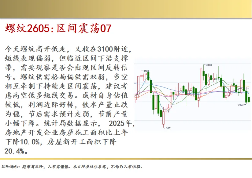 今天螺纹高开低走,又收在3100附近,短线表现偏弱,但临近区间下沿支撑带,需要观察是否会出现区间反转信号。螺纹供需格局偏供需双弱,多空相互牵制下持续走区间震荡,建议考虑高空低多短线交易。成材自身估值较低,利润边际好转,铁水产量止跌为稳,节后需求预计走弱,节前产量小幅下降。统计局数据显示, 2025年,房地产开发企业房屋施工面积比上年下降10.0%,房屋新开工面积下降20.4%。
