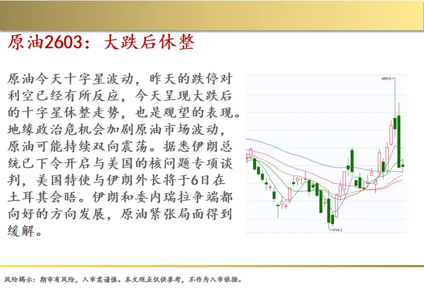 原油今天十字星波动,昨天的跌停对利空已经有所反应,今天呈现大跌后的十字星休整走势,也是观望的表现。地缘政治危机会加剧原油市场波动,原油可能持续双向震荡。据悉伊朗总统已下令开启与美国的核问题专项谈判,美国特使与伊朗外长将于6日在土耳其会晤。伊朗和委内瑞拉争端都向好的方向发展,原油紧张局面得到缓解。