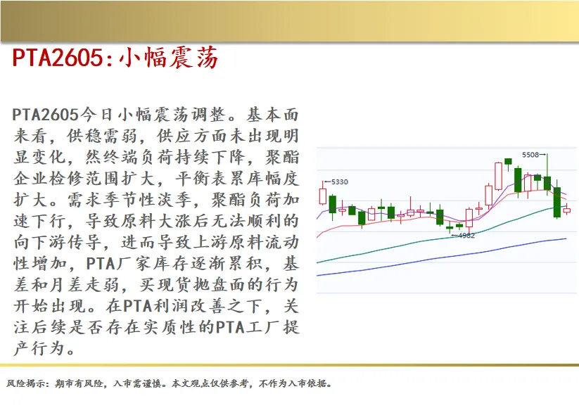 PTA2605今日小幅震荡调整。基本面来看,供稳需弱,供应方面未出现明显变化,然终端负荷持续下降,聚酯企业检修范围扩大,平衡表累库幅度扩大。需求季节性淡季,聚酯负荷加速下行,导致原料大涨后无法顺利的向下游传导,进而导致上游原料流动性增加,PTA厂家库存逐渐累积,基差和月差走弱,买现货抛盘面的行为开始出现。在PTA利润改善之下,关注后续是否存在实质性的PTA工厂提产行为。